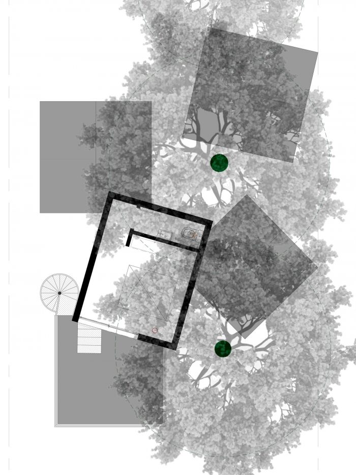 该地块有4棵树沿其长度方向排列。该方案不仅避免了接触任何树木,而且利用了这种情况,因为房子被保护在白蜡树的树冠下,形成了一个 "绿色保护伞"。