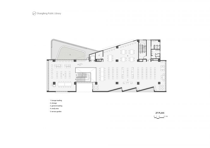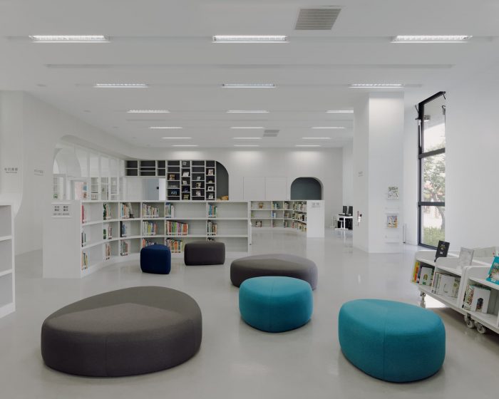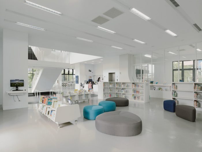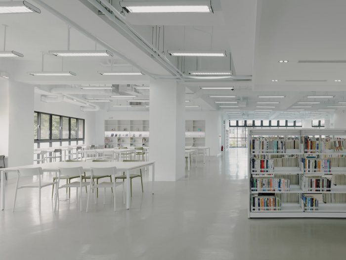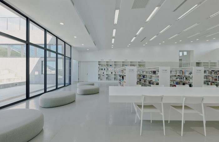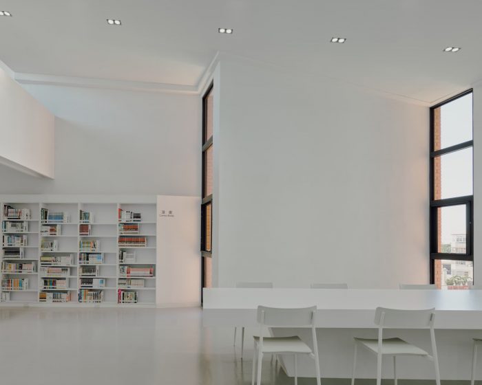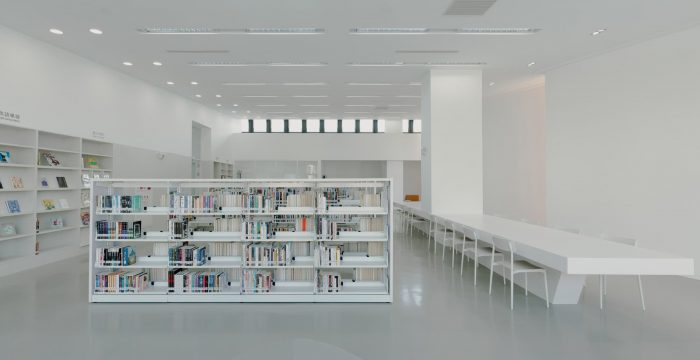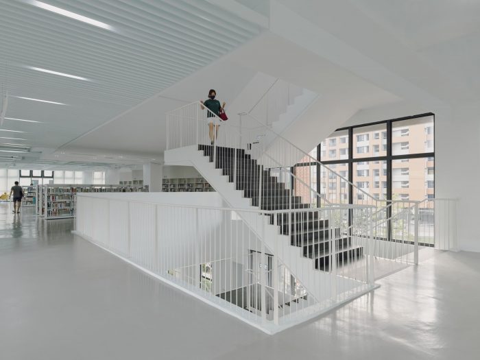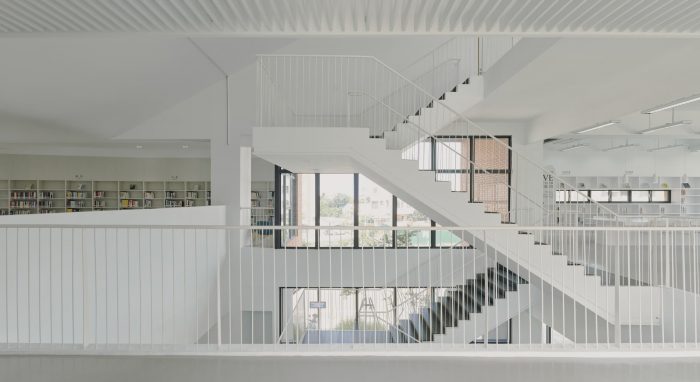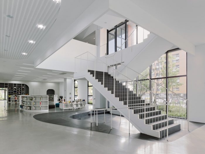 The idea of the library is to be a neutral container of books as well as the space and its surroundings. The surfaces of different materials inside are all painted in white, to heighten the abundance of natural sunlight, its warmth, and colors at different times. Textures of these materials surfaces cast subtle shadows and offer different shades of whiteness to enrich the sense of space. Once entered the library, people will be greeted with a sumptuous view of the outdoor landscape in the foyer thanks to large windows facing north at one side. On the other side is an airy central atrium that acts as a pivot to all spaces in the library. The ribbon-like stair in the atrium meander three floors of the library, directing or hinting at spaces beyond.