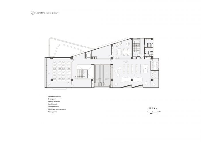 三楼有一个多功能教室和青年部,这是最吵闹的项目。因此,它们被放置在顶部,远离下面的安静阅读。年轻人区的屋顶可以升起,让南方的间接柔和阳光洒满整个空间。当人们认为图书馆的空间序列即将结束时,人们会突然发现,当他们转过头时,一个大型的户外屋顶花园正在等待着他们。屋顶花园是倾斜的,所以人们只能瞥见向上和向外的景观,因此鼓励读者走到外面去,进一步发现我们应该在知识的海洋里。