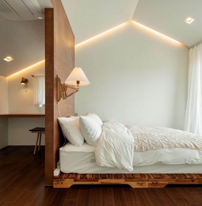 Designing of this space required a lot of thought from the beginning to the end, since I wanted to give different kinds of voluminous and cozy feeling in small spaces using various objects and configurations. The resulting space is clean, crisp, and relaxing, yet hides many interesting small details.