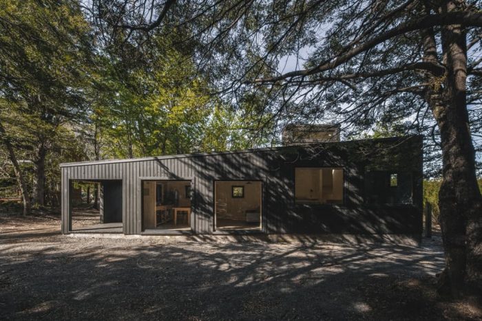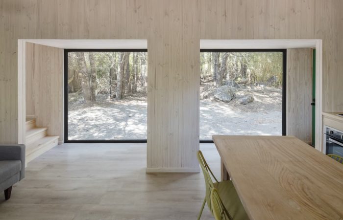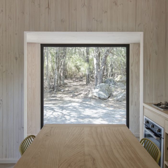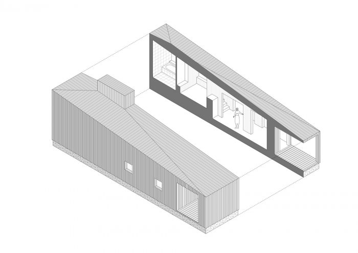 There are two predominant spatial conditions. The first is that each act within the shelter has a visual projection towards the landscape. The cooking and eating area, the living room, the sleeping area and the bathroom each have a two meters wide opening. The second, is that the circulation is a linear corridor, which provides a thickness that transforms the views into a spatial frame through which to look at the landscape.