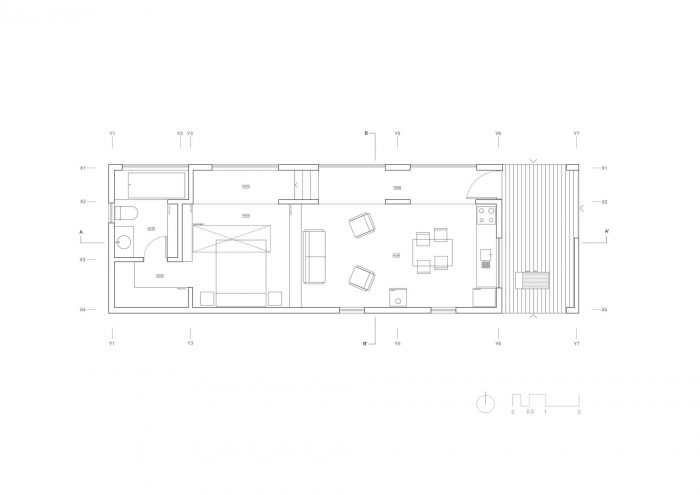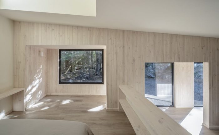 有两个主要的空间条件。首先是庇护所内的每个行为都有一个面向景观的视觉投影。烹饪和饮食区、客厅、睡眠区和浴室都有一个两米宽的开口。其次,循环是一个线性走廊,它提供了一个厚度,将观点转化为一个空间框架,通过它来观察景观。