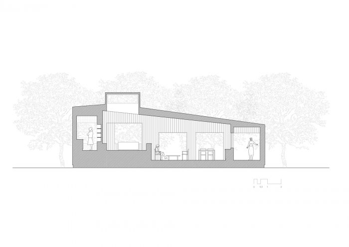 北面有一个林区,这成为打开主要视野的景观方向。相应地,该项目在东西轴线上是一个单一的水平空间,以大的开口向森林开放。