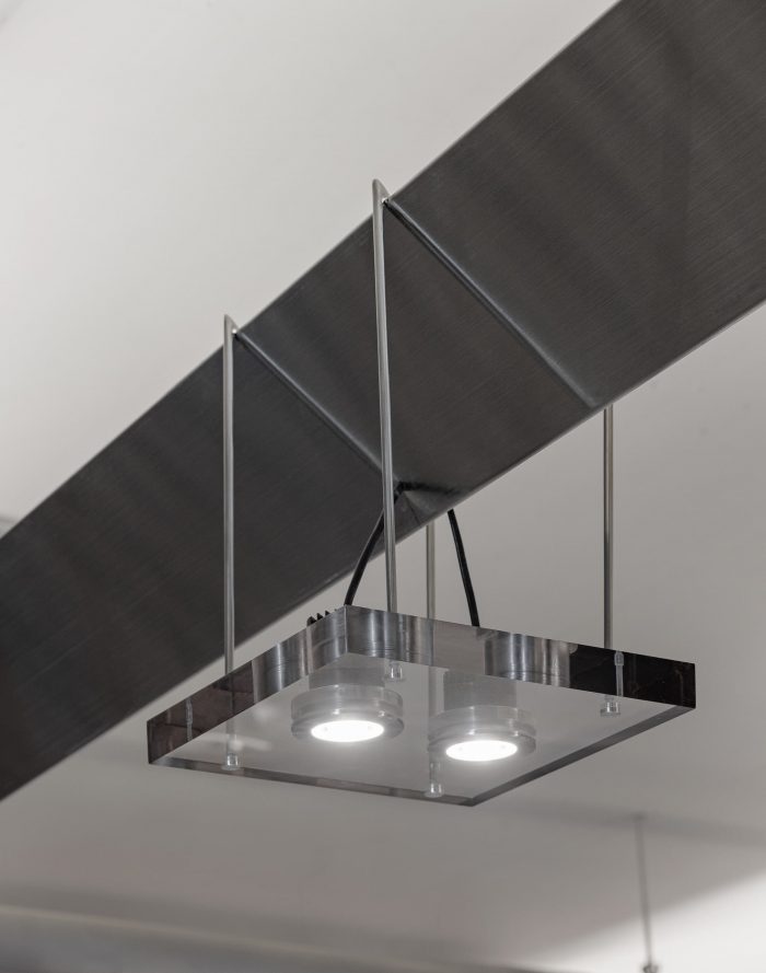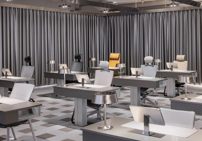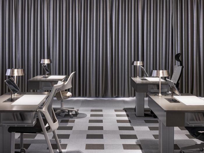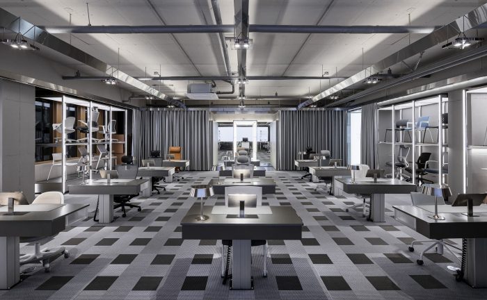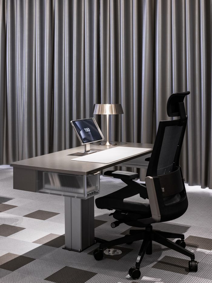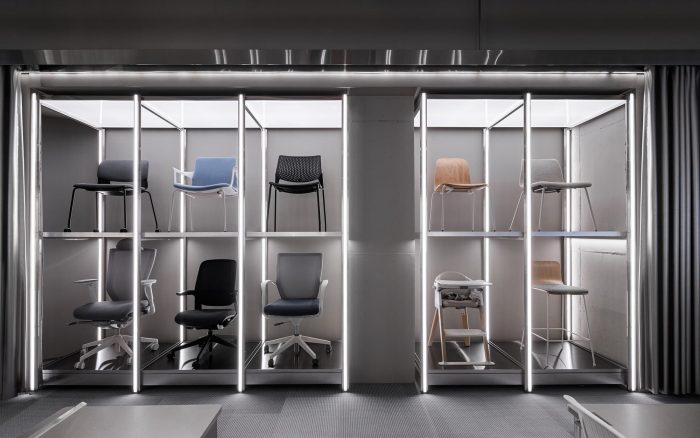 Betwin Space专门制作了与12把椅子相匹配的固定运动办公桌,虽然它们有原创的材料和设计,但它们看起来并不觊觎主角椅子的位置。相反,它们完全是作为椅子的助手,色调和形状都很克制。此外,安装在动感办公桌上的立灯和像聚光灯一样落在12把椅子上的顶灯也能引起人们的沉浸感。这种选择和集中是SIDIZ Nonhyeon旗舰店的设计核心。