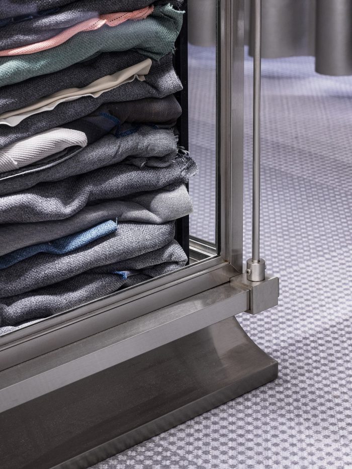 这家旗舰店的另一个特点是,空间元素是彻底为体验椅子的个人量身定做的。事实上,没有多少东西能像椅子一样个性化。这家旗舰店允许参观者彻底选择适合自己体型和品味的设计。每张运动台提供的'产品特定信息搜索'有助于这一迷人的探索之旅。从正确姿势的指引开始,产品的具体功能、详细的试穿选择、造型提示,甚至产品订单都是一站式进行的,在提供准确信息的同时,也自然地增加了坐在椅子上的时间,增加了体验的深度。由于空间的地理特点,旗舰店位于二楼,品牌的蓝色搭配现代材料和品牌,表达了品牌的感性,架子是透明的,加强了椅子的形状。