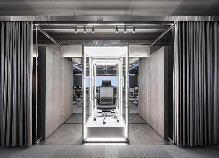 坐姿体验区是一个设计元素,通过银色的窗帘将所有的目光集中在中心,关注一种新的 "坐姿体验 "方式,以及具有内部和外部扭曲的空间,以最大限度地提高好奇心和 "坐姿体验"。为此,单独制作了一个运动台,检查你的坐姿是否正确,你可以把注意力集中在椅子上,这样你就可以通过充分的坐姿、体验和探索来找到自己的椅子。紧凑的用户体验设计和空间设计,诚实地揭示了品牌的功能和合理框架,使旗舰店的吸引力加倍。媒体墙也是引起综合体验的一个重要因素。集中式的结构有助于图像的沉浸感。这种安排通常用于教堂或教室,但只要将椅子面向媒体墙放置,就会增加对视频的关注。