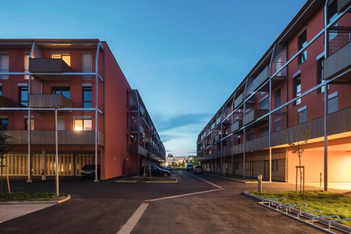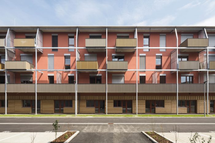 地面停车位与底层紧凑、可灵活分割的商业单元相得益彰。建筑语言和项目的物质性反映了方案、建筑系统和经济的原则。它使建筑的结构与阳台、外墙和底层的使用协调一致。阳台系统的框架是由简单的镀锌钢段建成的。它的垂直方向与SlimBuilding®系统的轴线一致,而预制混凝土阳台则铺设在它的水平支柱上。栏杆是由梯形轮廓的卷材铝板制成的。阳台可以在两个位置上设置。这对系统网格的严格秩序产生了一种有节奏的对立。红色渲染的外墙和金色调的阳台之间的色彩游戏使建筑构图更加温暖和有趣。