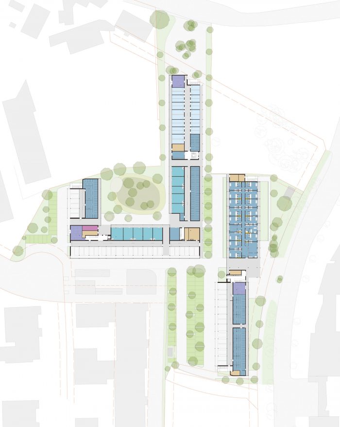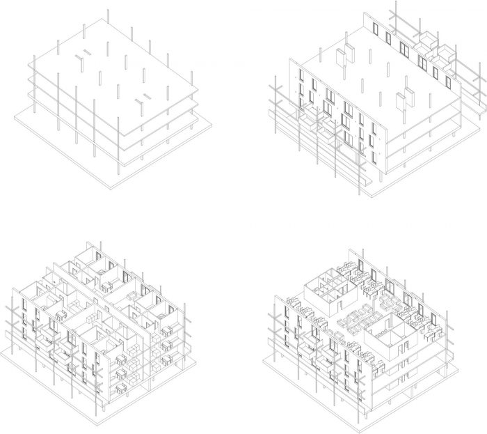 SIE/Home21 is a multifunctional building. It is also an ambitious social housing project that provides 244 units of exceptionally affordable housing for members of society who rarely have access to quality dwellings. This project is a part of the City of Vienna’s “Rapid Housing Program” (Sofortwohnbau-Programm); it was planned and built in an exceptionally short period of 20 months. It was the demands of this program that brought its diverse functions together under one roof. The Rapid Housing Program was a response to Vienna’s housing crunch of 2015-2016; it subsidized the pro tempere erection of housing upon underutilized, commercially zoned real estate. This housing could either be composed of temporary, mobile constructions or comprise permanent buildings with fixed-term occupancy for housing. Home 21 fits to the latter category. This fact underlies its use-neutral multifunctionality. The building will provide the city with housing for the first 10 years of its lifecycle, after which it must be capable of being economically converted into commercial property. This precondition required a simple, rapid and use-neutral construction.