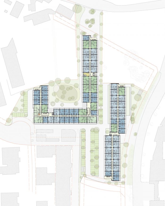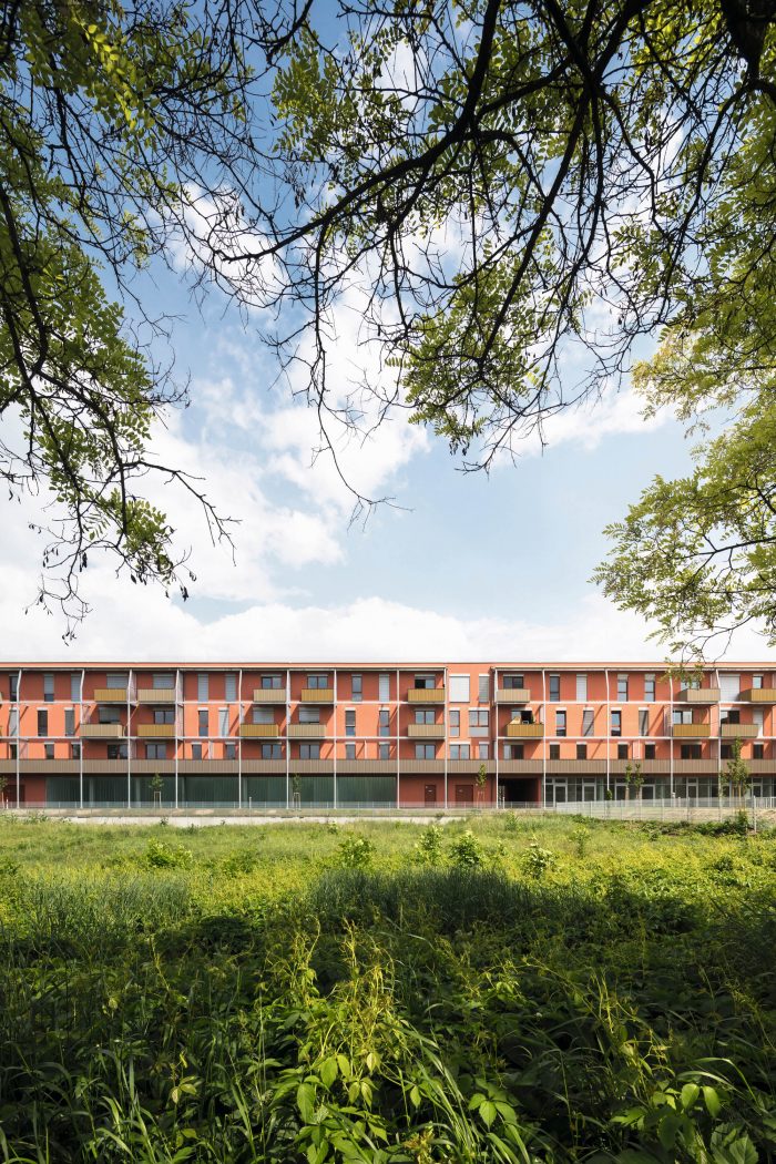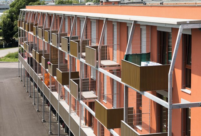 At-grade parking complements the compact, flexibly sub-dividable commercial units on the ground floor. The architectural language and the project’s materiality reflect the principles of program, building system and economy. It harmonizes the building’s structure with the balconies, the facade and the ground floor usage. The frame of the balcony system is built out of simple, galvanized steel sections. Its verticals align with the axes of the SlimBuilding® system, and the pre-cast concrete balconies are laid upon its horizontal consoles. The balustrades are built out of coil-coated sheet aluminium in trapezoidal profile. The balconies can be set upon the consoles in two positions. This generates a rhythmic counterpoint to the strict order of the system’s grid. The play of colour between the red-rendered facade and the gold-tones of the balconies lends the architectural composition warmth and interest.
