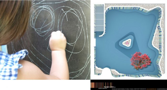 Folding the floor in order to define the heigth of a child, with his small scale, make possible we could perceive space like ‘an embrace below’: ‘space is able to hold us in its hands’.