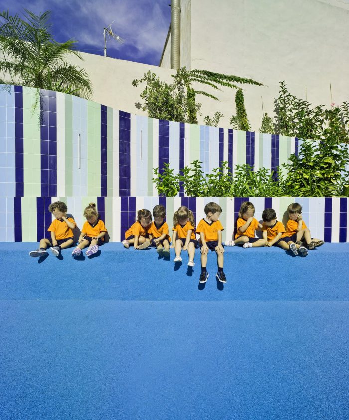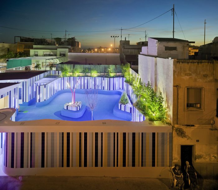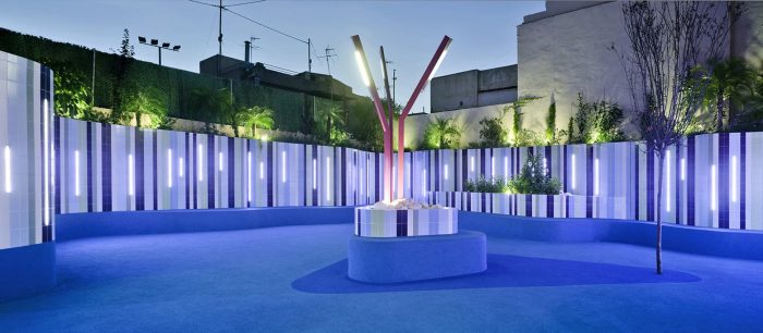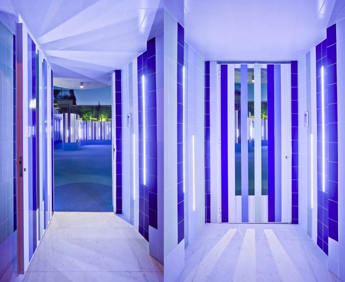 The artificial lighting of that space offers the same vibrant, sequenced character throughout the night just like the day, by using thin luminaries inside the vertical joints of the ceramic pieces.
