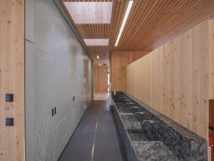 The interior is designed to match a wide range of situations, depending on function and needs. The bright, open and inviting ground floor brings the outdoor surroundings and the scenic background in through the extraordinary glazed sections stretching from floor to ceiling. The preschool has a lunchroom, an auditorium, group rooms, and a room for physical activities with a shared play and movement zone centered around organically shaped wooden furniture. Through a huge skylight, light pours into the building from the top floor all the way to the ground level.