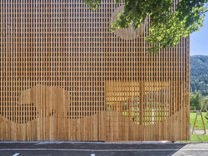 The preschool stands out in the landscape as a large wooden construction with wooden slats forming the ventilated exterior. Every aspect of the design is imbued with creativity. Outlines of different animals appear in the wood – butterflies, deer, a bear. The viewer’s senses are moved and activated with just a single look at the building.