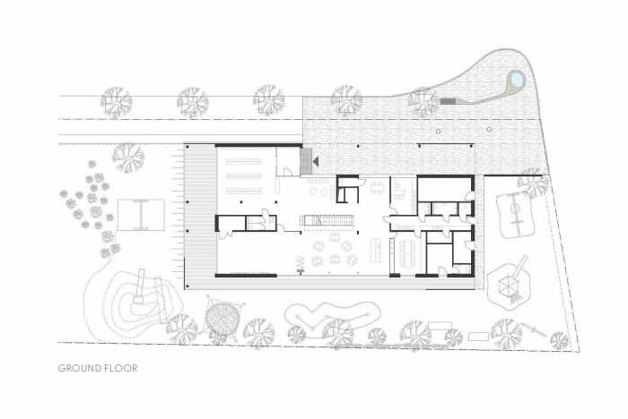 The outdoor areas offer free space to play. The courtyard features a trickling fountain that connects the street level to the covered entrance area. The back garden is a green carpet of grass and plants with an adventure playground constructed of wooden elements.