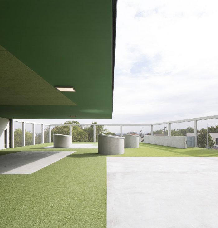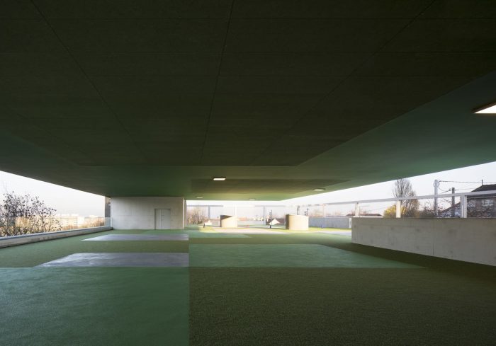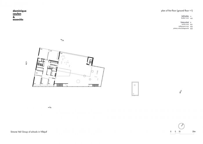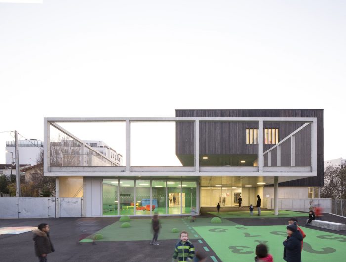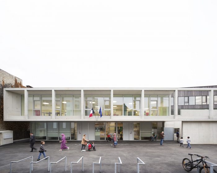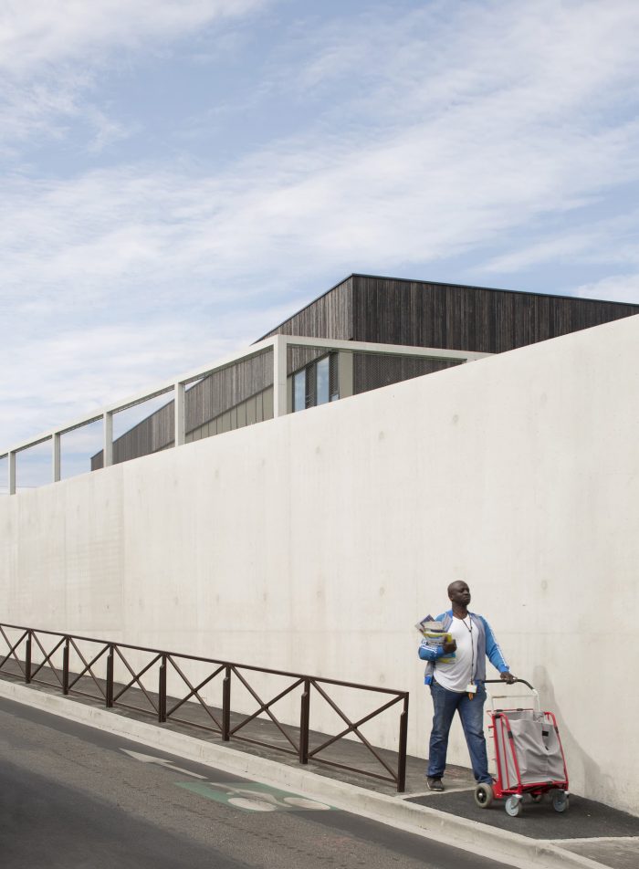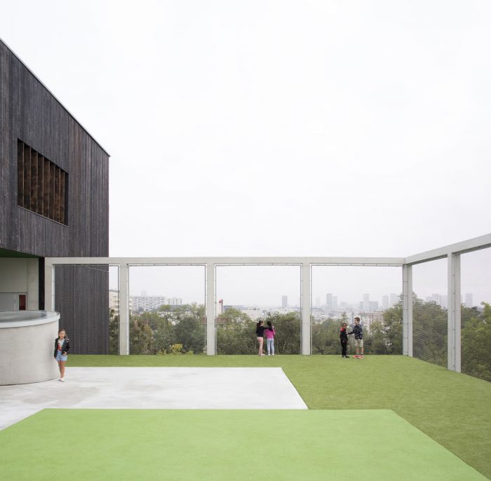 Within this enclosed site, three different access routes preserve fluidity by offering several destinations, including a shared forecourt. The nursery school and space for out-of-school activities occupy the ground floor, opening out onto a large playground. A library, next to a central patio, occupies a double height, thereby introducing a visual link with the elementary school on the upper levels. These may be accessed by stairs leading directly to the playground on the first floor. A large overhang frees up space and provides a panoramic view of Paris. It is remarkable for its writing and its materiality.