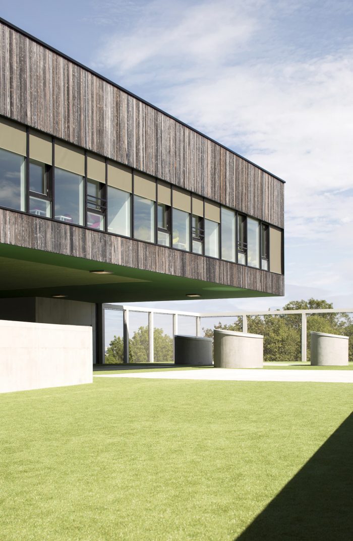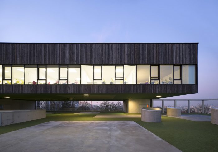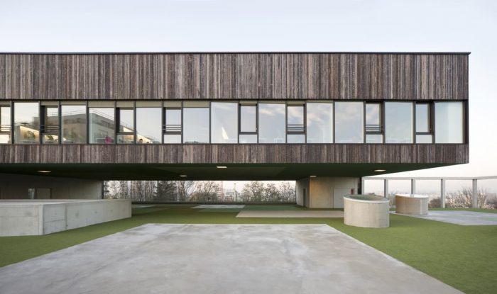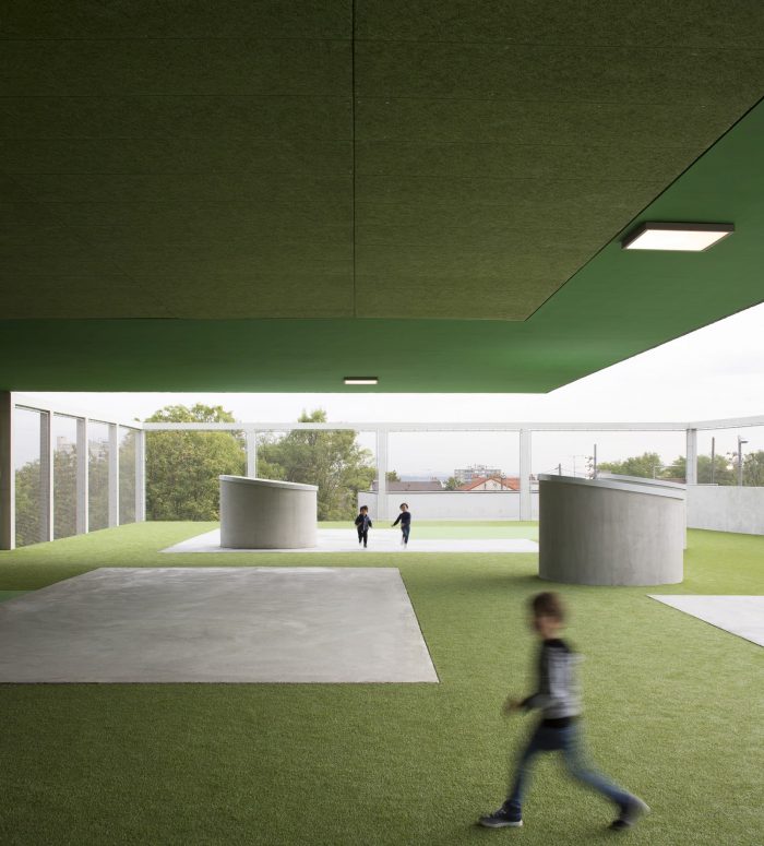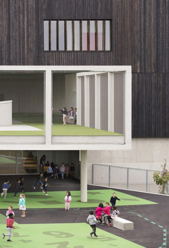 Thus this upper playground is designed as a large empty space stretched out beneath the volume of scorched wood that houses the elementary classes. The different shades of green that are used are in keeping with the wooded site. The building echoes the landscape, creating harmonious relationships.