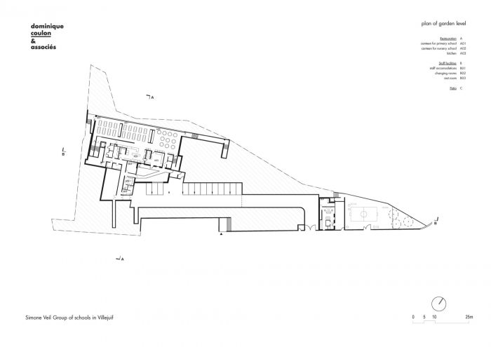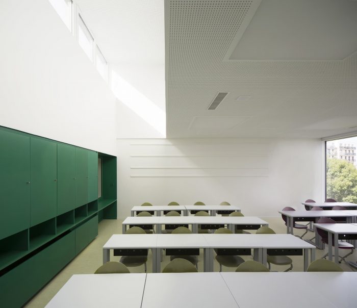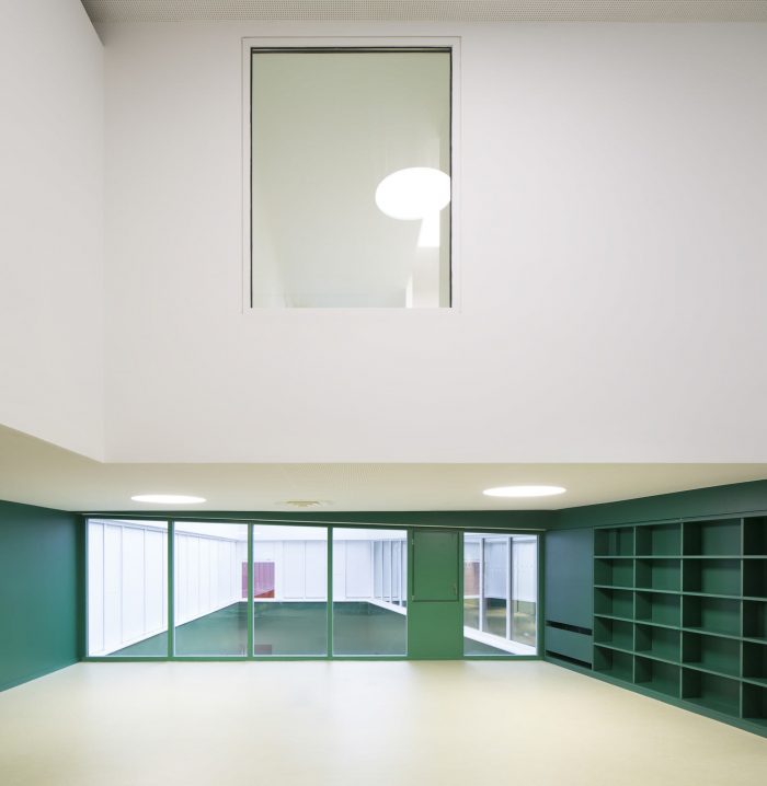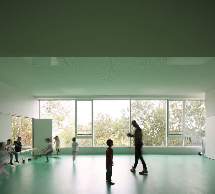 The clear geometry of the classrooms provides the pupils with landmarks and makes it possible to install lighting and visual systems that add quality to their use and appropriation. The nursery classes look out onto the large trees, as do the canteen areas on the garden level; the elementary classes are also well-endowed with windows.
