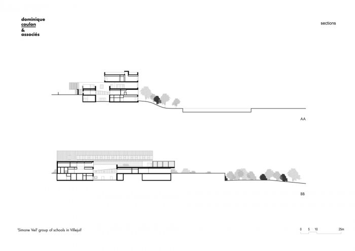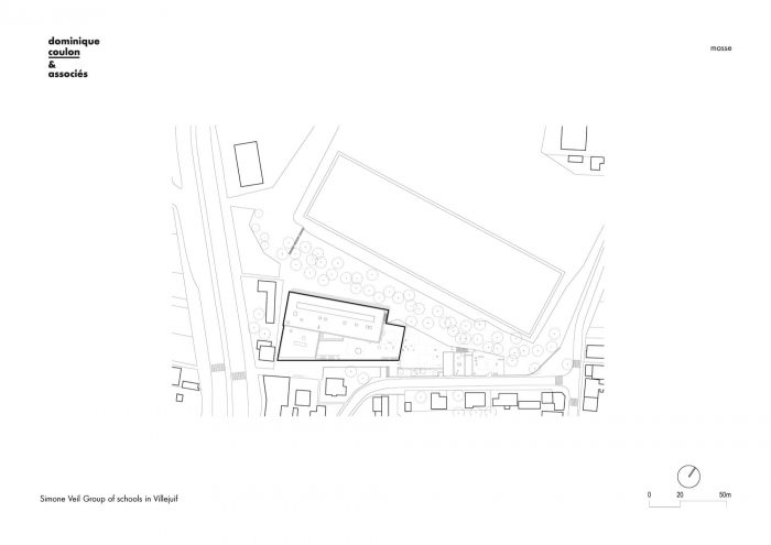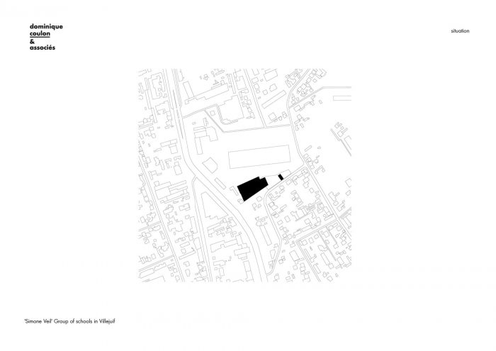这组学校是应对巴黎郊区维勒尤夫镇中心和北部地区校舍短缺问题的一部分。它所在的水库地块在该镇是很特别的,有两点:它受到保护,不受声音干扰,而且除了水景之外,还有一些大树。