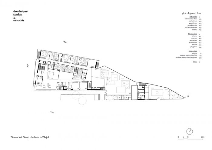 在这个封闭的场地内,三条不同的通道通过提供几个目的地来保持流动性,包括一个共享的前院。幼儿园和校外活动空间占据了底层,向一个大操场开放。挨着中央天井的图书馆占据了两个高度,从而引入了与上层小学的视觉联系。这些都可以通过楼梯直接通向一楼的操场。一个大的悬臂释放了空间,并提供了巴黎的全景。它的写作和材料都很出色。