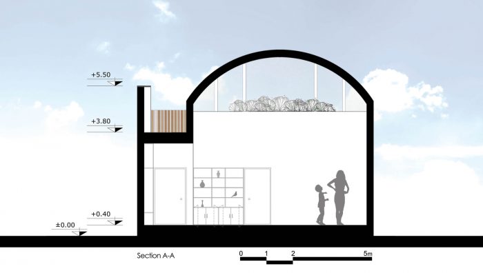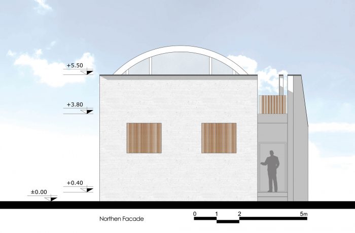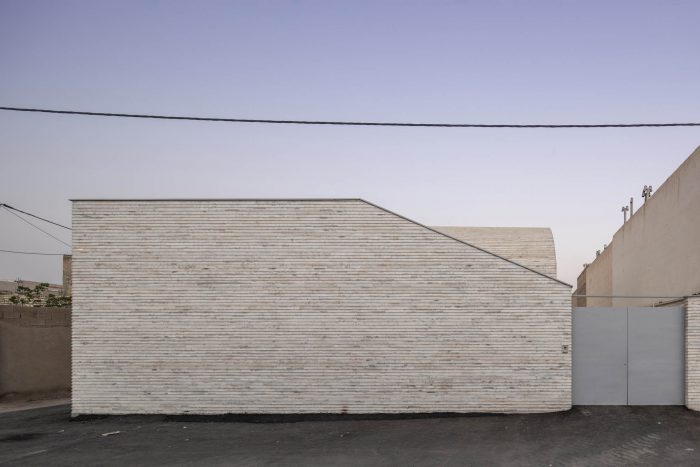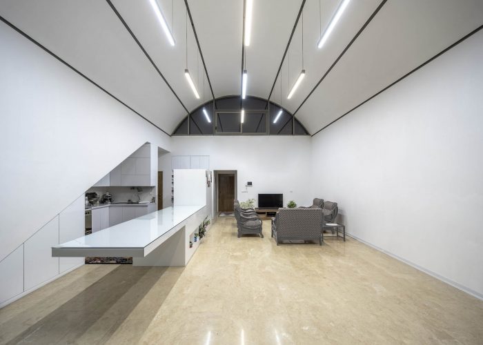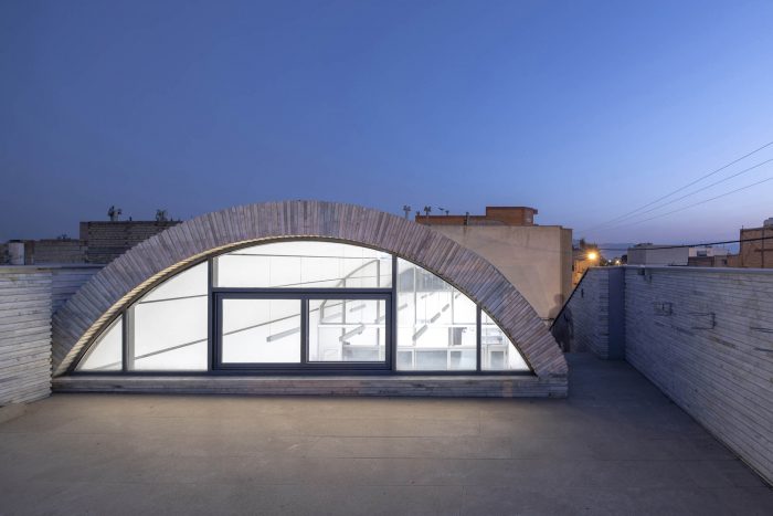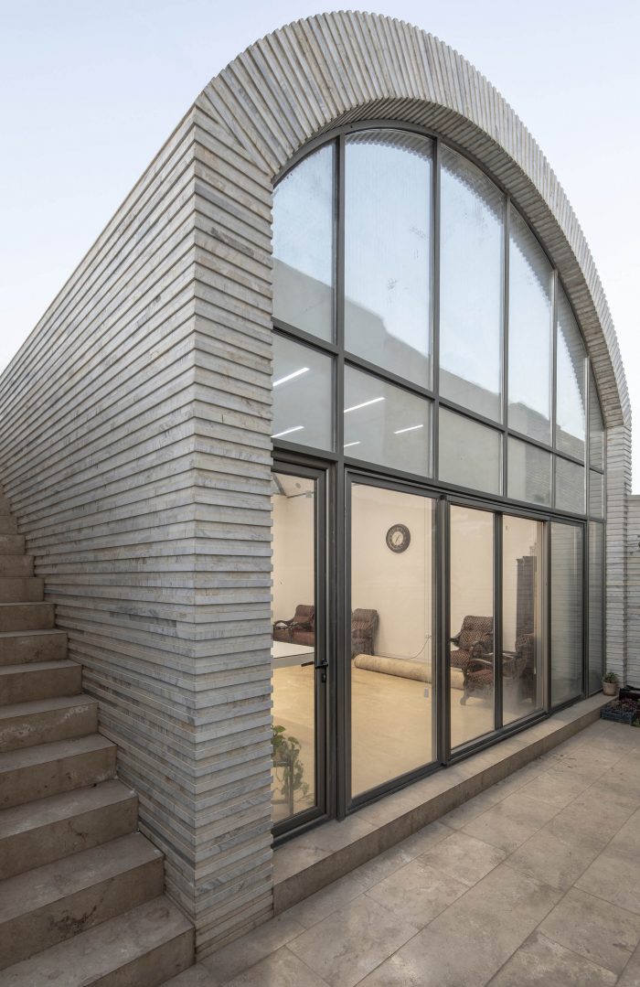 客厅和餐厅被安排在一个大拱顶下,这个拱顶是根据在纳贾法巴德的历史房屋中看到的肋骨拱顶模式。它们往上走,使室内空间可以从北方看到上层院子(在私人区域的屋顶上)。这个院子和通往院子的楼梯通过西边相邻的小路的墙被保护起来,不让路人看到。这面墙还修改了土地的形状。为了整合整个建筑的主体和天花板,利用了在该地区发现的经济的乡土石材。这样一来,房子里所有的公共空间都统一在一个拱顶之下,为游客提供了一种与纳贾法巴德的历史房屋记忆相结合的愉悦感;这些房屋在附近的小巷里仍然可以看到,在当地人中被称为肋拱门。
