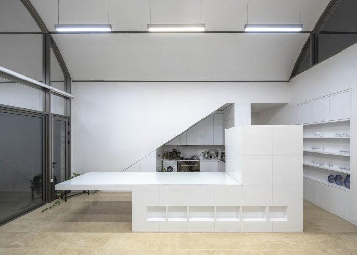The small size of the land and the client’s request to make an economical one-floor building were the challenges of this project. Given the client’s agreement with the municipality and the spaces he demanded, approximately 80% of the land was allocated to the building. The plan was simple; a living room and dining room on the south, a narrow one-walled kitchen on the west, and two bedrooms with lower height on the north side.