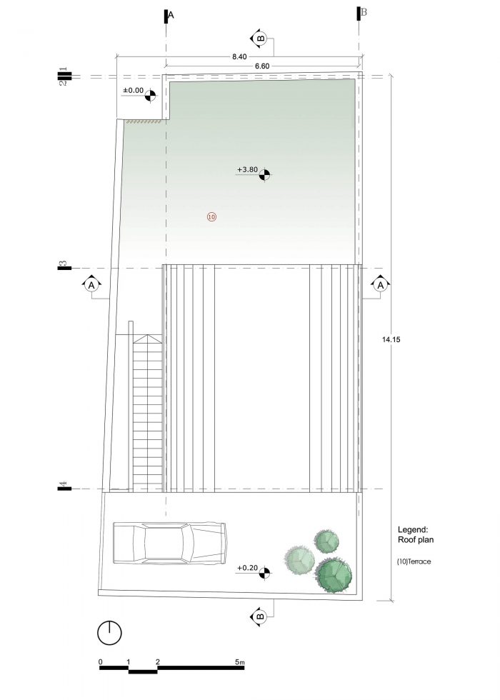 由于土地的开放部分太小,无法创造一个南部的院子,而且事实上,我们必须建造唯一的单层建筑,屋顶的一部分充当了北部院子里的一个充满活力的空间。在西侧的楼梯,与小路相邻,提供了通往卧室屋顶的通道。因为建筑的西北角由于在巷子里的位置,必须要有斜面,所以在这部分的回处理使入口。这样一来,从私人区域和公共区域之间的距离进入房子就成为可能。