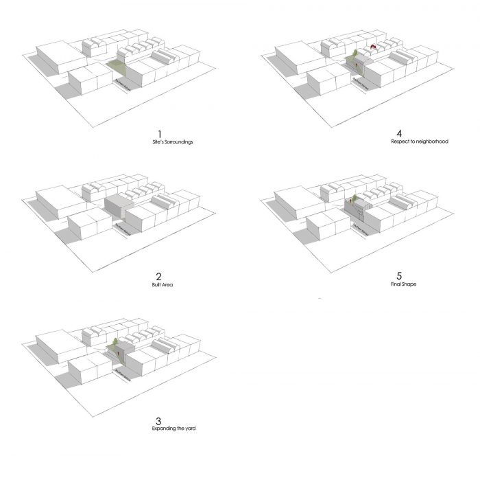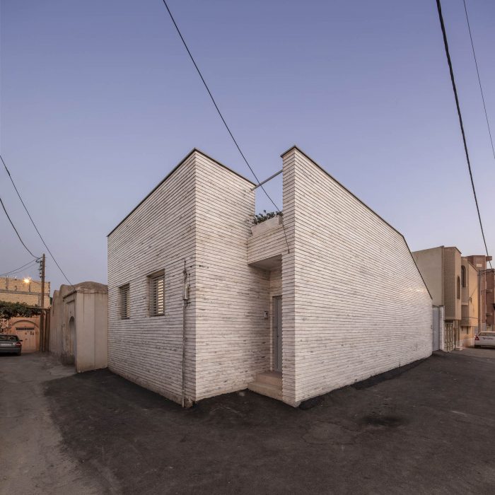 Since the open part of the land was too small to create a southern yard and the fact that, we had to build the only one-story building, part of the roof acted as a vibrant space along the yard in the north. A staircase on the west side, adjacent to the path, provides access to the roof of the bedrooms. Because the northwest corner of the building has to be beveled due to its position in the alley, retreatment in this part made the entrance. In this way, entering the house is possible from the distance between the private and the public areas.