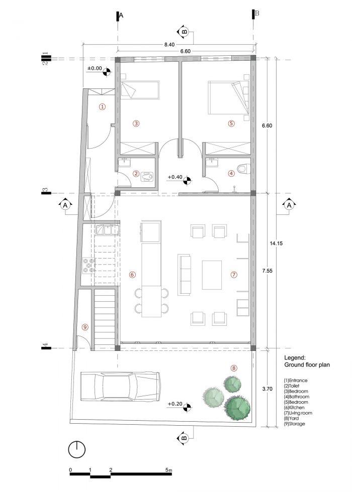 土地面积小,客户要求做一个经济的单层建筑,这是这个项目的挑战。考虑到客户与市政府的协议和他所要求的空间,大约80%的土地被分配给建筑。计划很简单,南边是客厅和餐厅,西边是狭窄的单壁厨房,北边是高度较低的两间卧室。