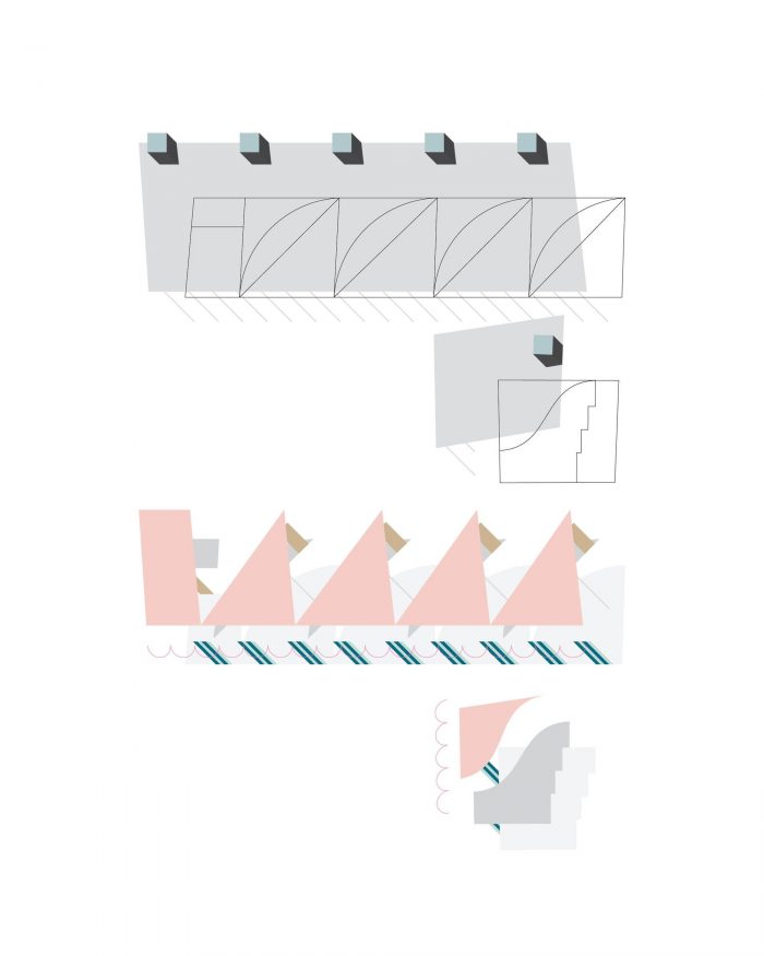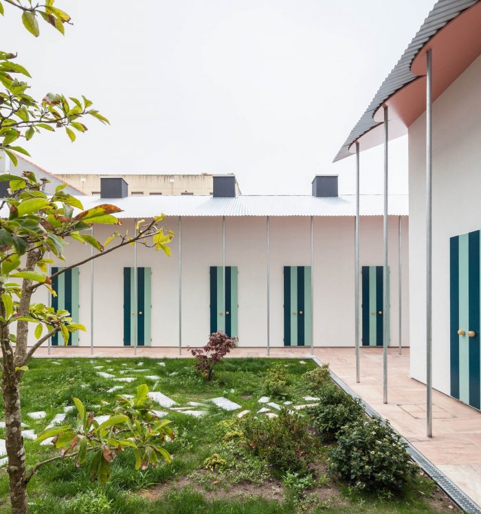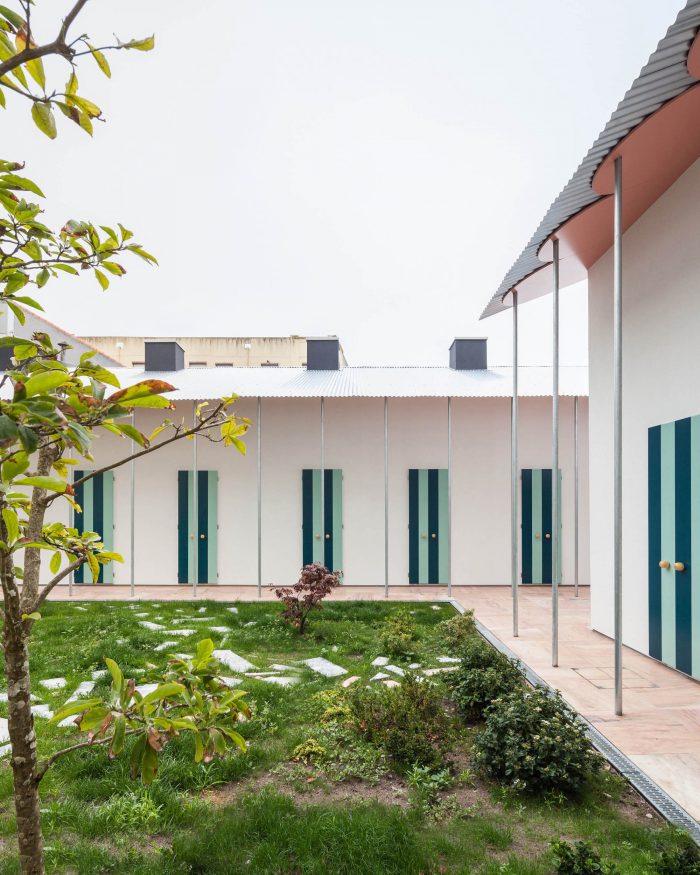 On the outside, the houses define a continuous colonnade framing a collective garden where it becomes impossible to understand where each houses begins or ends. The façade is an overlap of several rhythmic rows - the thin metal columns, the striped blue doors, the black boxy skylights. The roof is made of two layers: a pink wavy plane is attached below the metal sheets emphasising the thinness of the surface. All around, the most honest and beautiful urban scenario defines the idyllic background for such an architectural exercise.