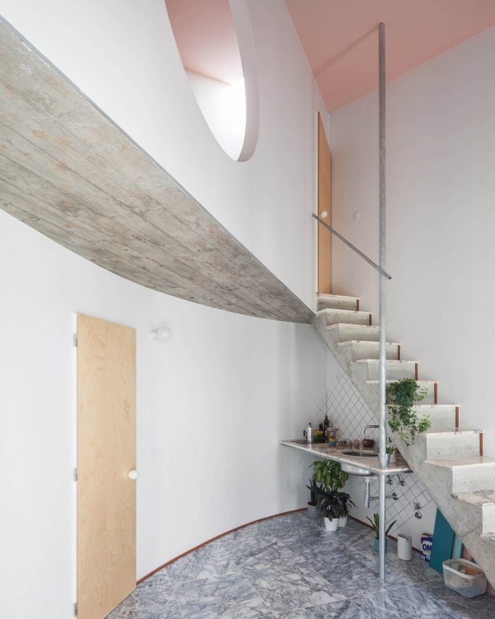 The materiality of the awkward interiors follows their complexity. Walls are merely white, the horizontal slabs are abrupt concrete, the floors display polished blue marble and the tilted ceiling is painted in pink. Wooden doors, exaggerated handles and hints of pink marble accompany this game of surfaces.
