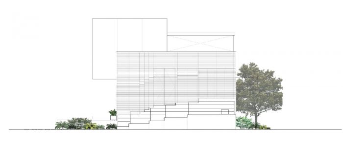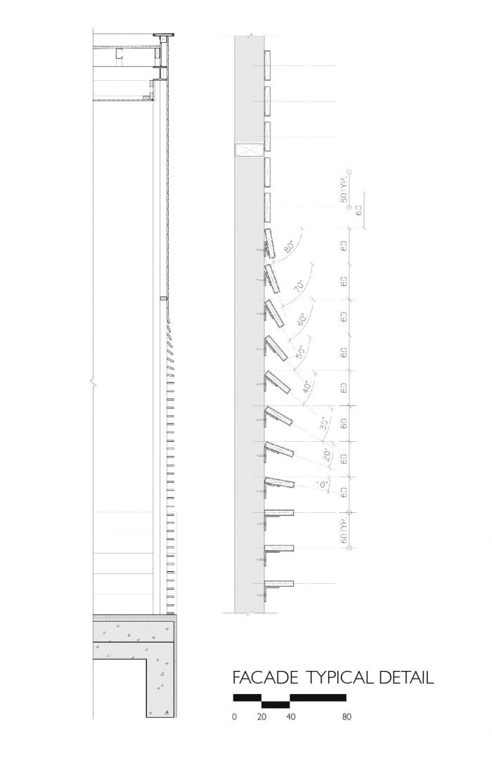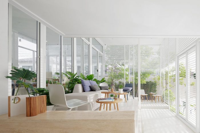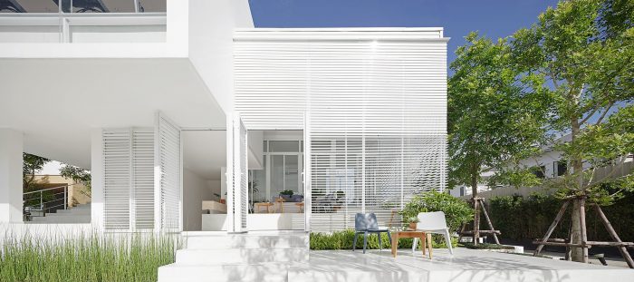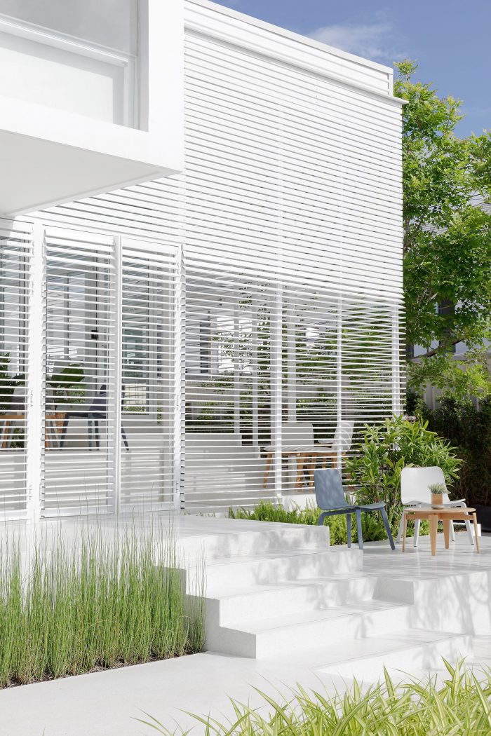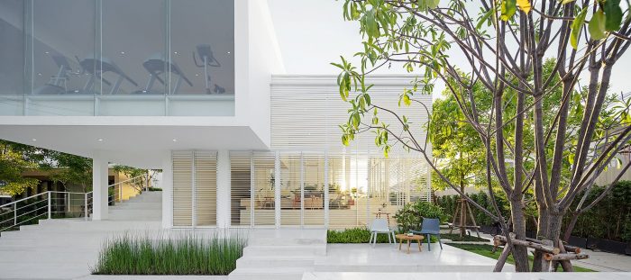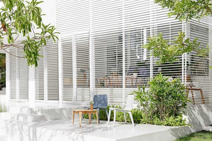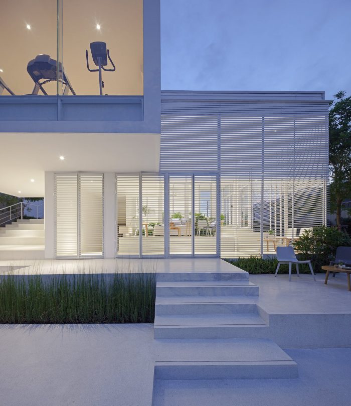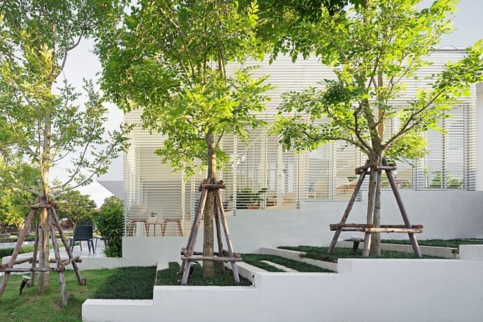 The overall materials are the standard economical material in Thailand, concrete, terrazzo floor, and aluminum window. But the main character of the building is the white aluminum stripes façade that covers all ground floor interior space, gradually twist from vertical to horizontal, help filter the natural light from above and connect the view below to the outdoor area and landscape garden around the site. As appear from outside, it like the building is slowly opening ‘the curtain’ to explore the outside world.