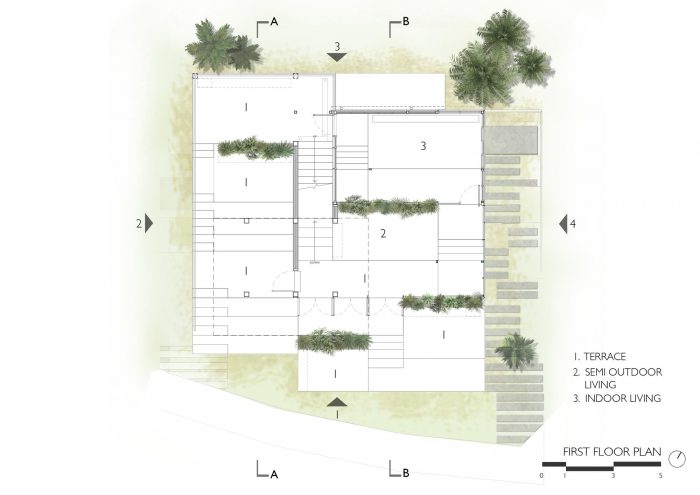 The step also used to divide the floor into each small platform that can serve various activities and functions. Each of these platforms provides with adequate space that can change to fit the need for several functions such as relaxing space, working table or amphitheater for a small group of people. Furthermore, between this platforms are integrated with a small garden that carefully placed to add the greenery atmosphere and create privacy between each platform at the same time.