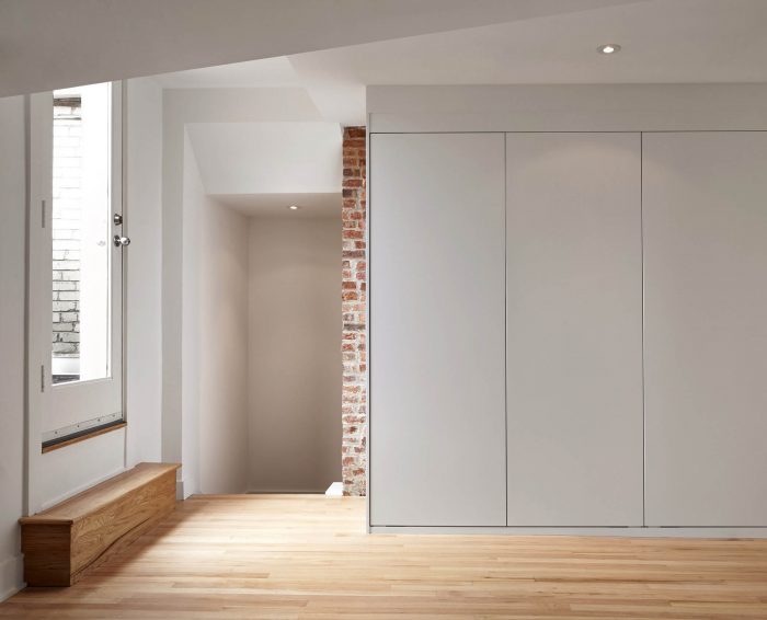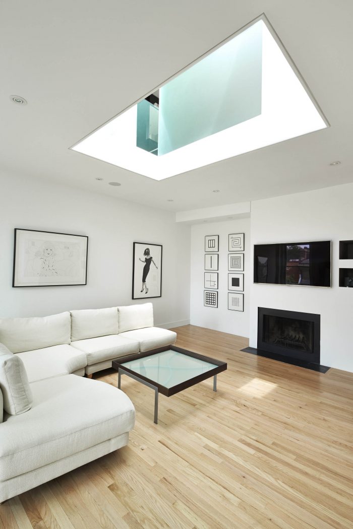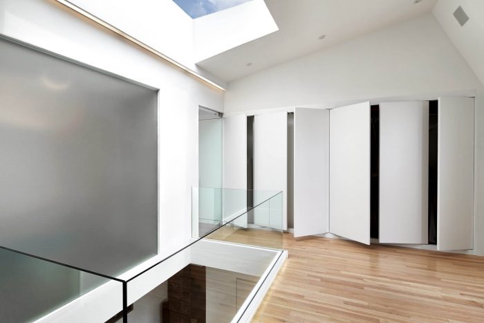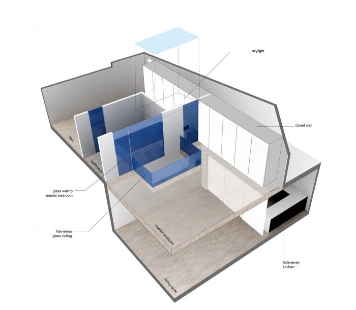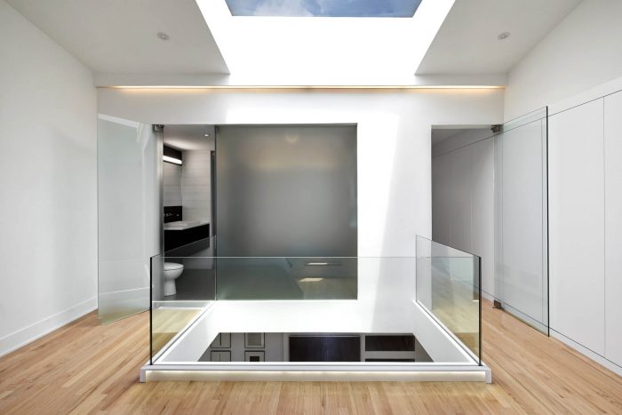 On the second floor a line of closets that runs the length of the apartment are concealed behind white pivot doors, allowing for a great deal of unexpected storage. The master bathroom is veiled behind large frosted glass panels, which serve as a visual focal point from the living room space below. The central skylight provides natural daylight to every room due to the transparency of the design.