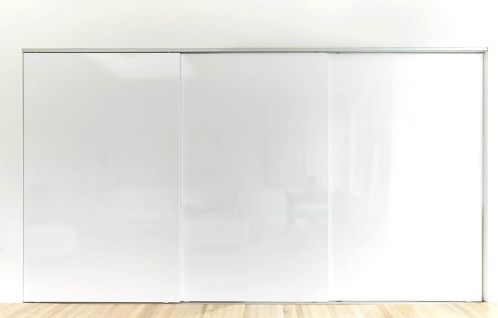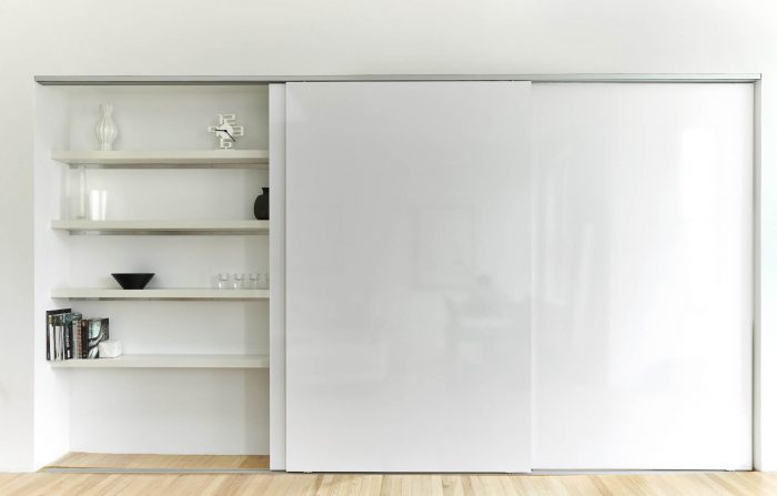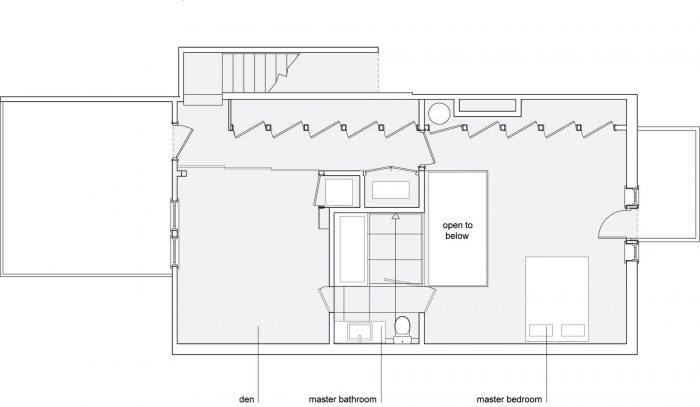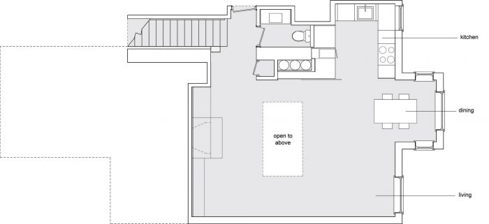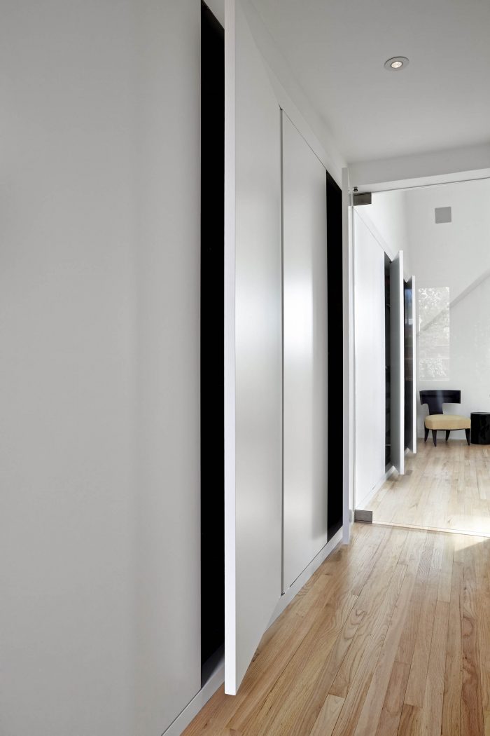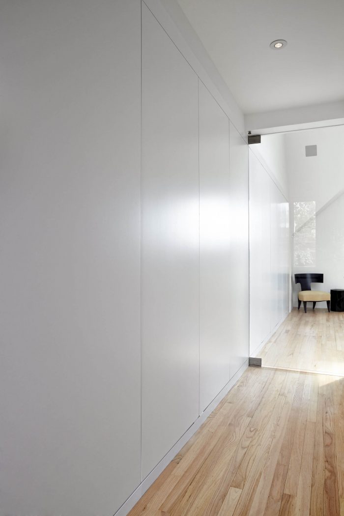 All ancillary rooms (kitchen, bathroom, closets, and staircase) are “hidden away” to preserve the purity of the primary two-story volume. The kitchen was enlarged for function, and can “disappear” behind sliding doors. Decorative shelving can also be exposed or hidden away.