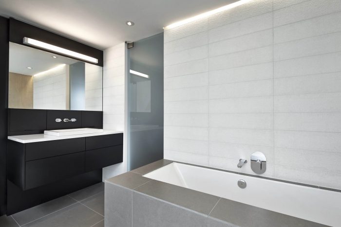 在二楼,一排贯穿整个公寓的壁橱被隐藏在白色枢轴门后面,允许大量的意外存储。 主人的浴室被隐藏在大型磨砂玻璃板后面,从下面的客厅空间作为一个视觉焦点。 由于设计的透明性,中央天窗为每个房间提供了自然日光。