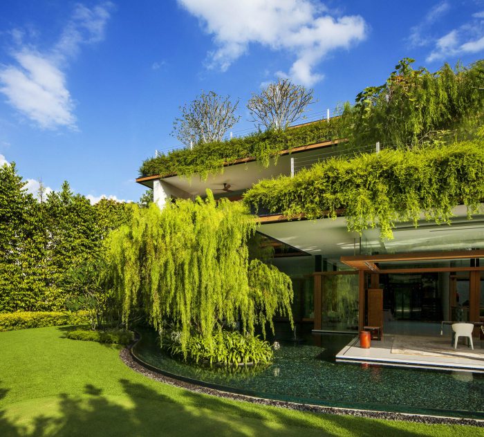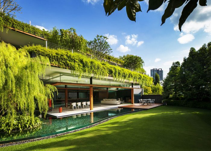 In land scarce Singapore, greenery and space for nature comes at a premium, so we conceived a design that satisfied the client’s brief, while giving greenery back to the neighbourhood and house. The layered roof gardens not only provide lush greenery when viewed from each level of the house, but also help to cool the house passively through transpiration of the plants. When viewed from outside, these overhanging plants soften the edges of what is quite a large house.