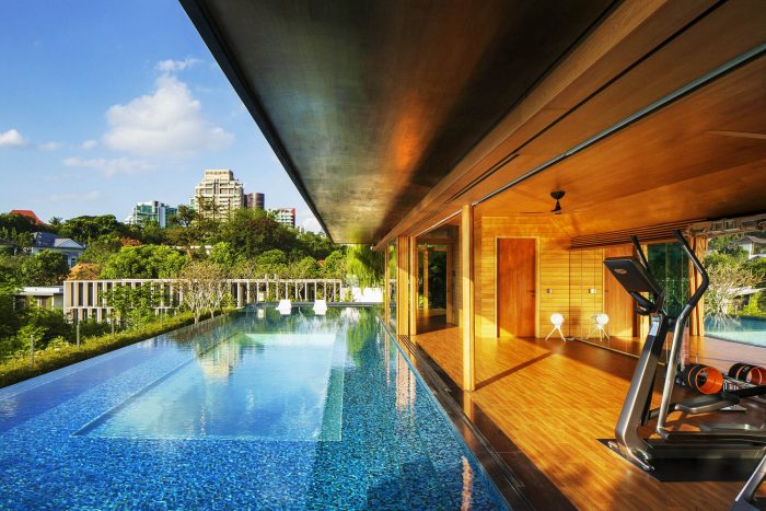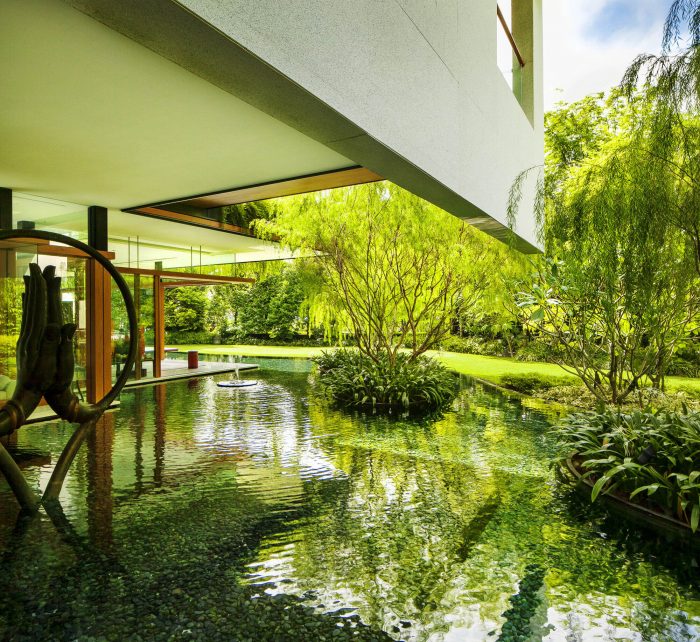 This atrium was in the heart of the house and allowed light to penetrate into what is quite a deep floor plan. Because it was under a swimming pool, very little heat is transmitted into the building, which is important in Singapore’s hot tropical climate. To also help passively cool the house, we provided large roof overhangs to shade from the tropical sun and rain. Photovoltaic cells also are installed on the roof.