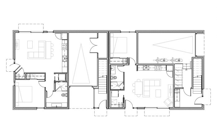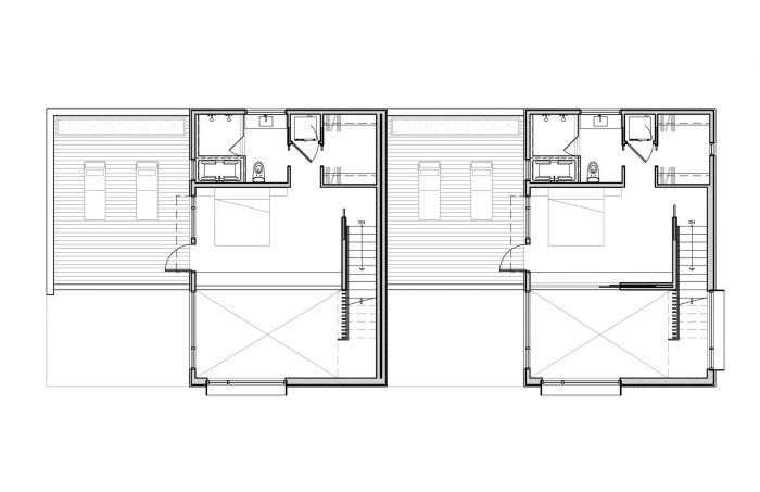 地面层由两个带室外天井的一居室ADU单元组成,上面有两个两层的联排别墅单元,有私人屋顶平台,可以看到西山的景色。联排别墅的比例和重复性在附近的单户住宅和街对面的高密度四层公寓楼之间架起了一座桥梁。