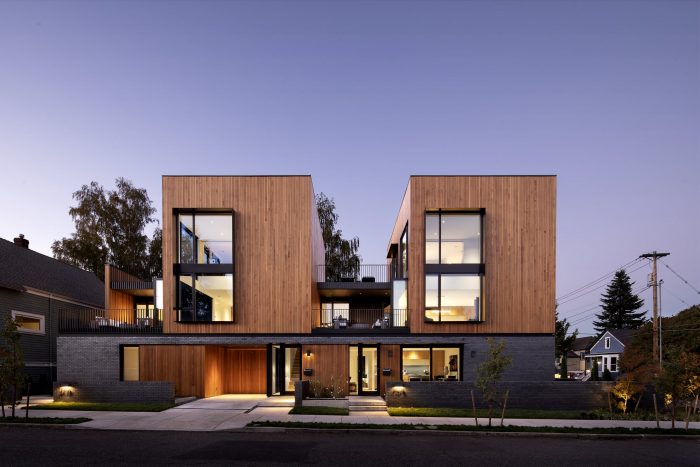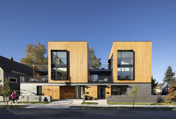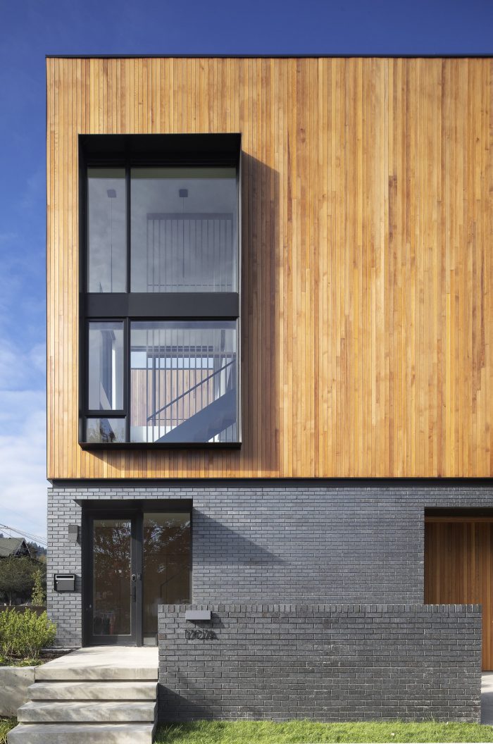 Inspiration for the form came straight from the area’s early history, with two wooden volumes, or stacks of slab wood, resting on top of a solid base. This solid base grounds the structure and provides a sense of security and privacy for its occupants. To keep the base modern and monolithic, a dark manganese iron spot brick was paired with a matching dark grout with raked joints – adding texture to the façade with a material that complements the surrounding context.