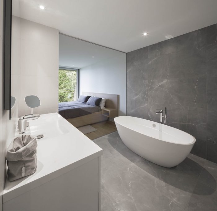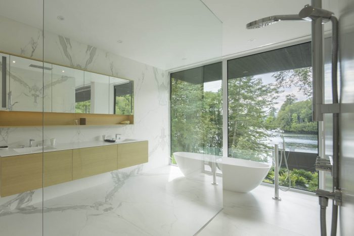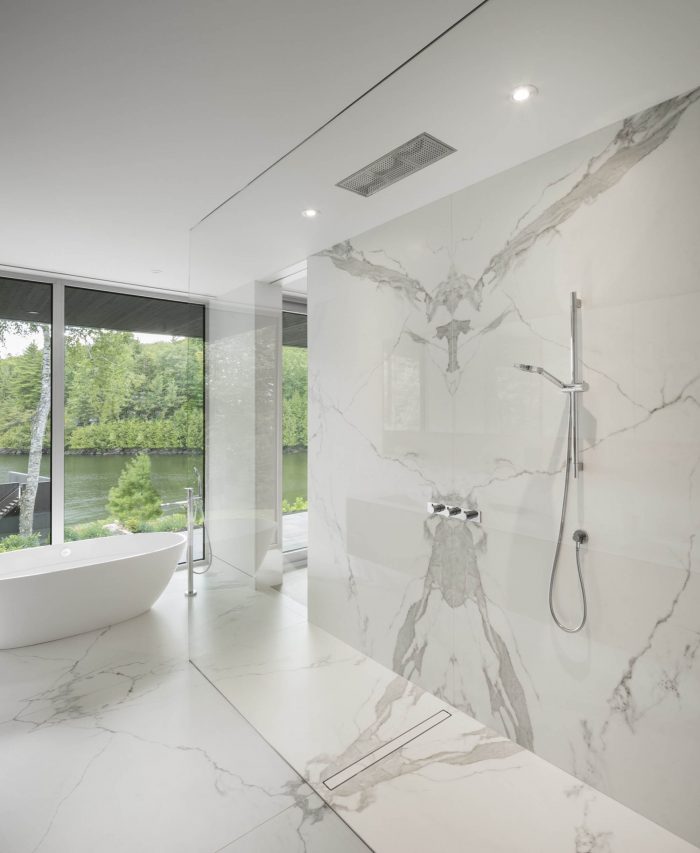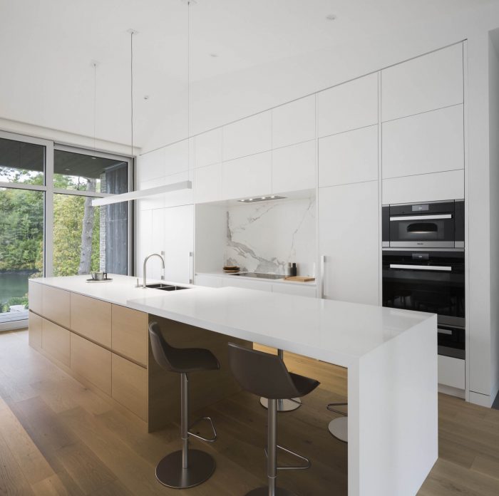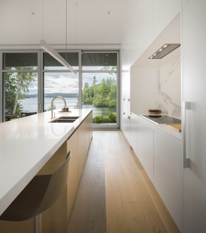Large bay-windows, skylights and immaculate white walls literally flood the space with light and offer breathtaking views of the lake. At times reaching 25 feet high, ceilings stretch to augment the amplitude of these living spaces. All the rooms of the Slender house are positioned to form one single linear row. In addition to the master’s suite, two high-end suites with full bathrooms and small adjoining lounge, a sauna and a training room compose the program of this luxurious house. A service corridor that connects the main entrance to the ground-floor entrance doubles as the entrance to the garage and gives access to a small washroom, laundry room and pantry that connects to the kitchen through a secret door.