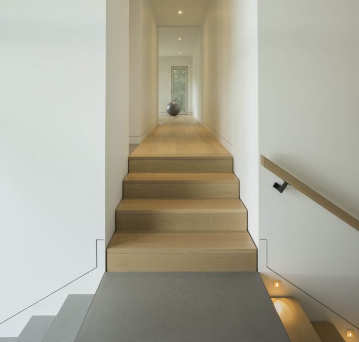 Precisely detailed to fit seamlessly within the black wooden exterior walls, a large garage door sits between the massive stone volumes. The discreet and fascinating approach gives us the impression of sinking into the ground between a hanging garden and the house. As one makes his way along these dark and massive facades towards the main access courtyard, a huge glass bay window marks the entrance from which a view of the lake is immediately revealed. The austere and rough appearance of the exterior stands in contrast with the very large, bright and airy interiors of the house.