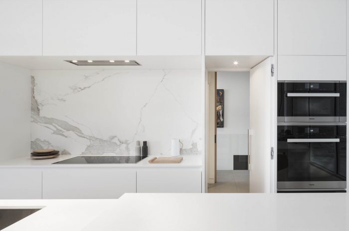 The whiteness of the kitchen is revealed as an extension of the walls and ceilings while the island is born from the extension of the floors that are covered in large blades of white oak.