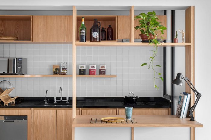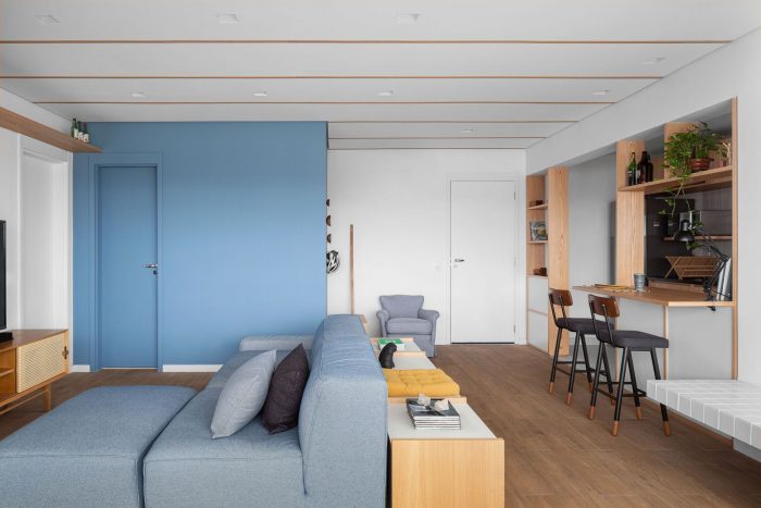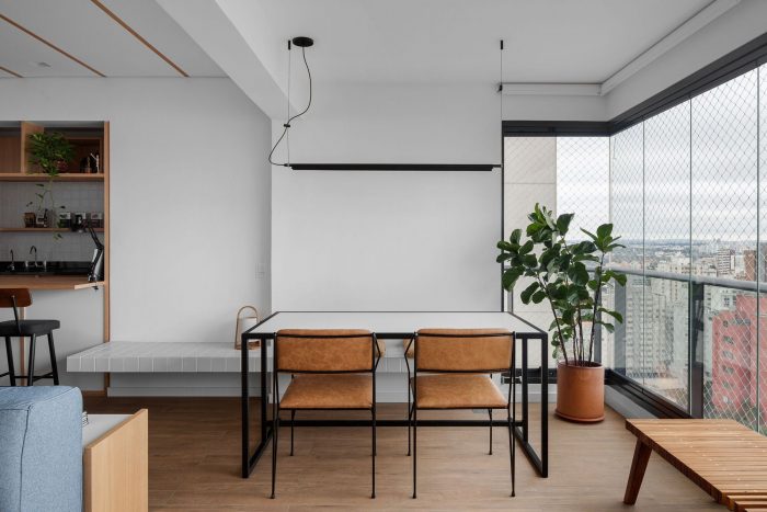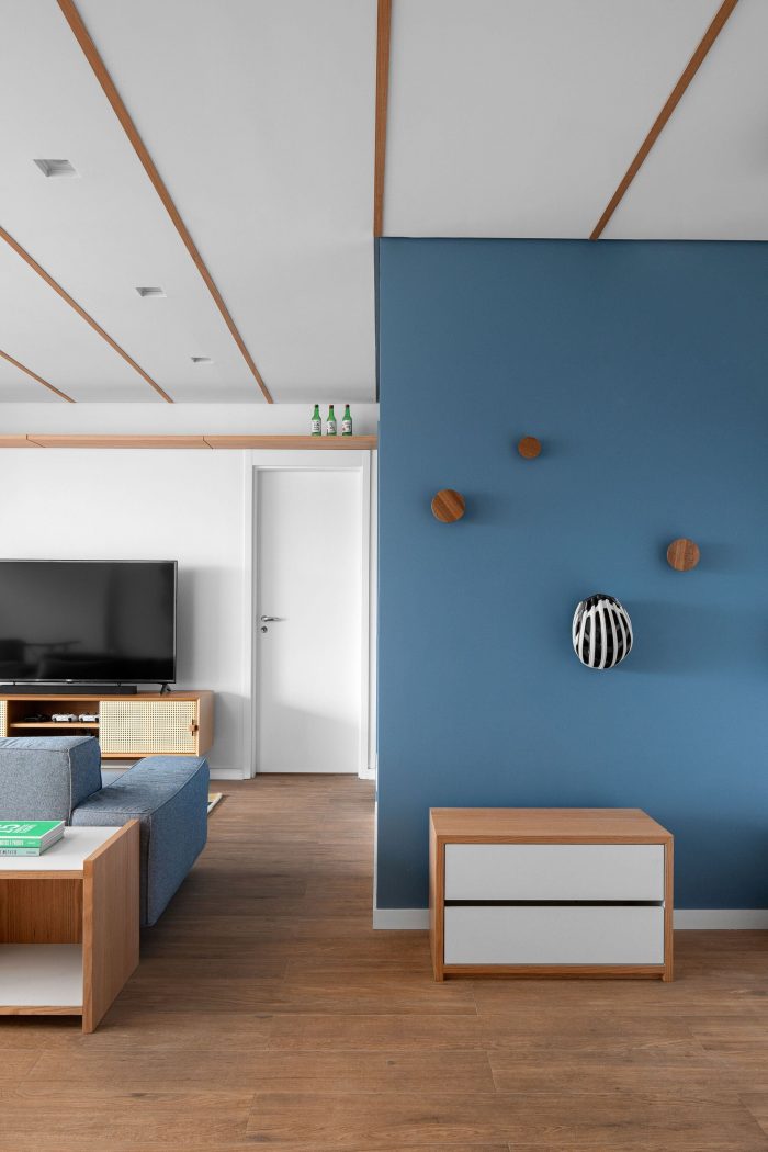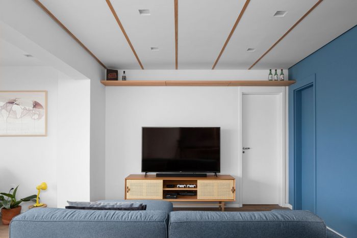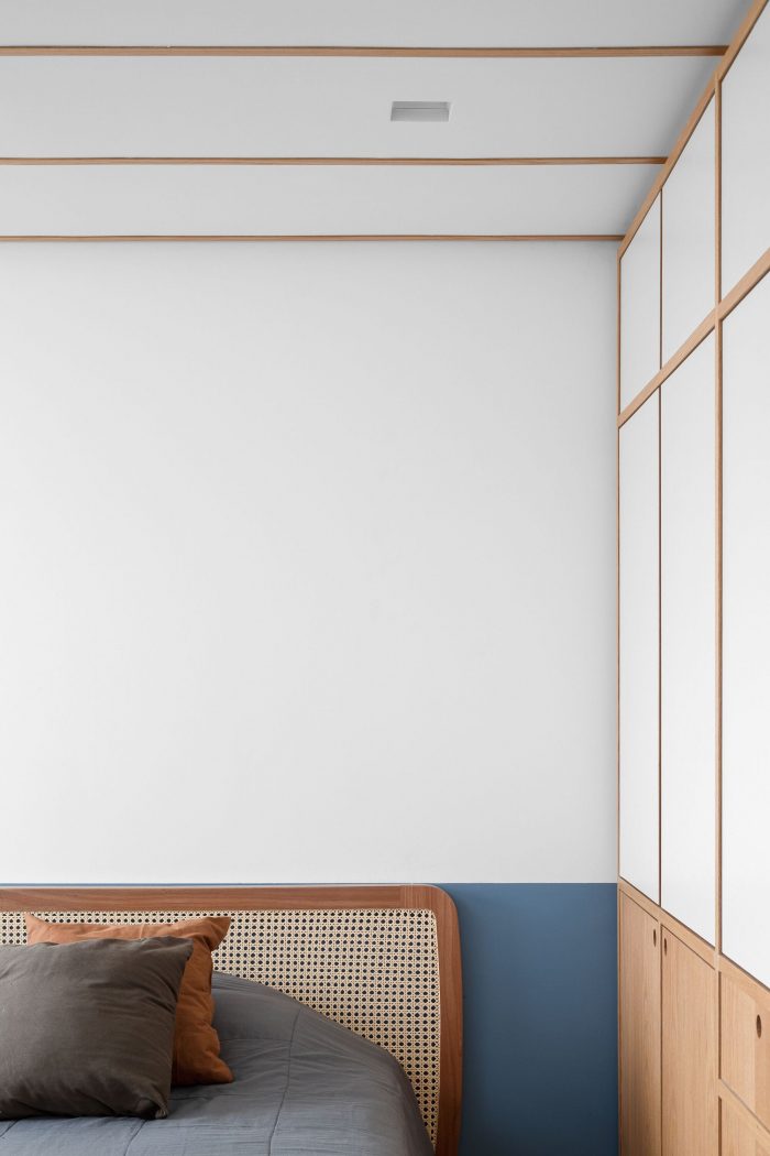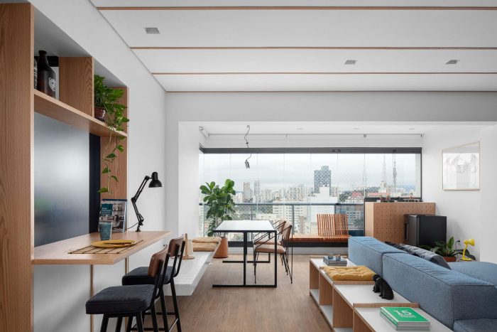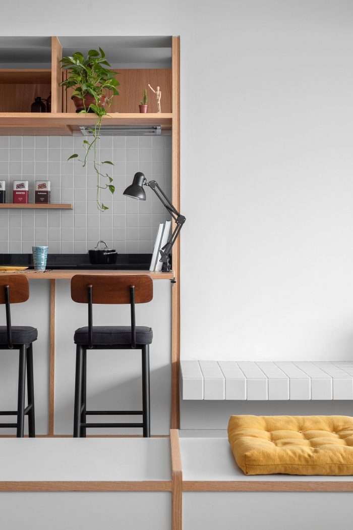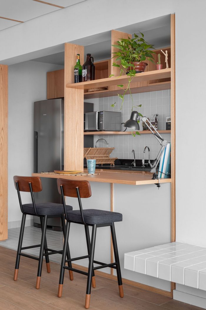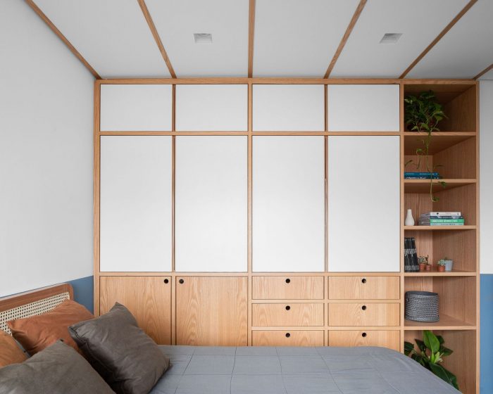 On the affective side of the project, we took into account that the client lived for a period of his life in Japan. We tried to bring a touch of the country through the "shoji" - traditional doors of Japanese houses made with wood and paper. We used a contrast of white Formica with wood in a rhythmic modulation of the joinery panels, leaving the vertical wood panels highlighted and aligned with the slats that run along the ceiling. An indirect and subtle mention to remind the resident of his time outside.