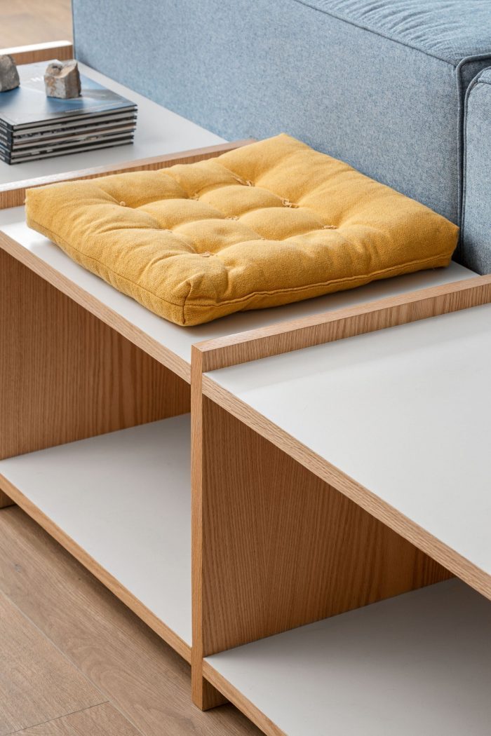 The apartment is part of a brief phase in the dweller's life. Thus we focused on using little cabinetry and loose furniture, so that he can take it with him in the future. We demolished the walls of the second bedroom and joined them to the balcony to enlarge his living room, making a unique and well-lit environment.