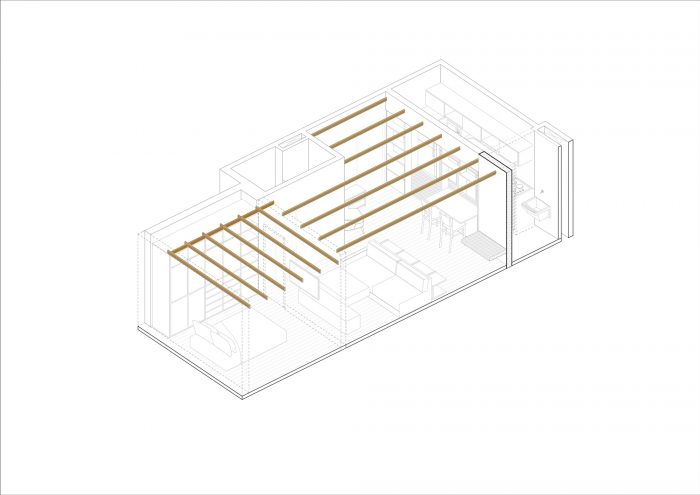 在这个70平方米的空间里,我们试图将居住者的日常生活的舒适性和亮度结合起来,以及偶尔接待朋友的空间。我们试图将这些实际愿望与他和他的新住所之间的感情关系结合起来。