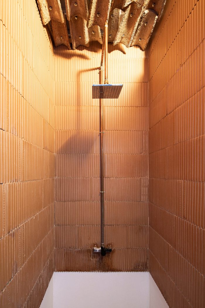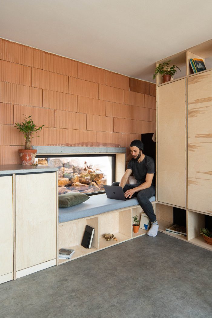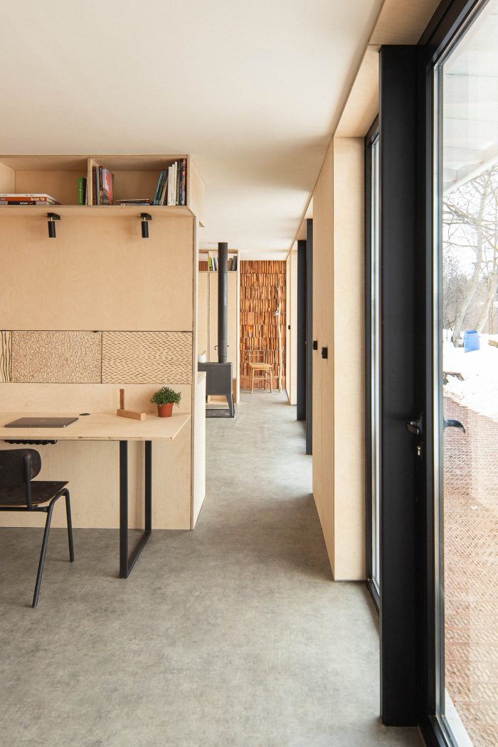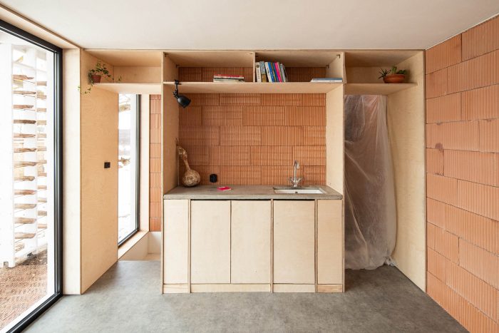 The clear floorplan structure and the open sunny spaces of the atelier offer shelter, comfort, and a creative atmosphere for its inhabitants. The creation of a simple, honest, and clean space is the very essence of the project. The use of materials in their ‘raw’ natural look is a harmonic addition to the rural surroundings. Clay used to be the main building material of the houses in the village. In this context the ceramic blocks of which the studio is constructed act as a contemporary interpretation of the traditional building technique. The used materials: ceramic bricks, timber, plywood, and visible concrete combine in a clear, harmonic integral structure supplementing the visual characteristics of the location.