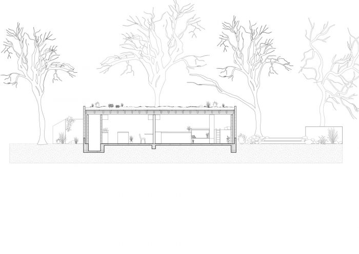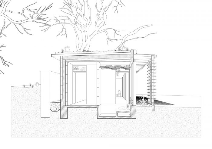 The studio provides a simple and humble/unpretentious way of life in harmony with the natural surroundings, facing all the needs of the contemporary lifestyle. The building is an inseparable part of the environment and in constant dialogue with the key elements, contributing to the unique character of the site/location – the dry stone walls, the old walnut trees, the adobe houses. Following the sustainability principles, the architectural design incorporates several main aspects: flat green roof, use of recycled materials, natural light, the specific design of the wall, and roof systems in search of maximum energy efficiency.