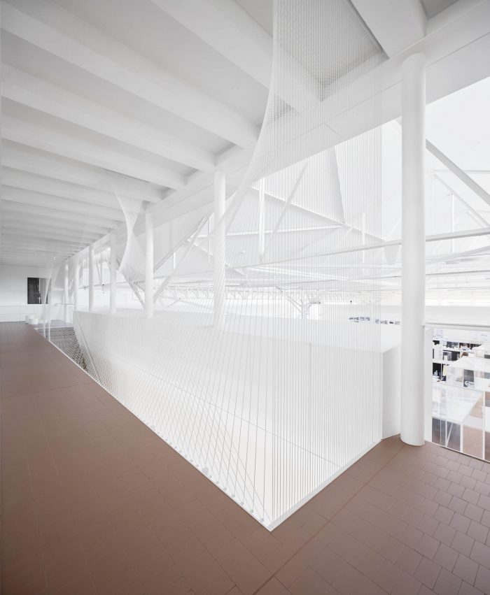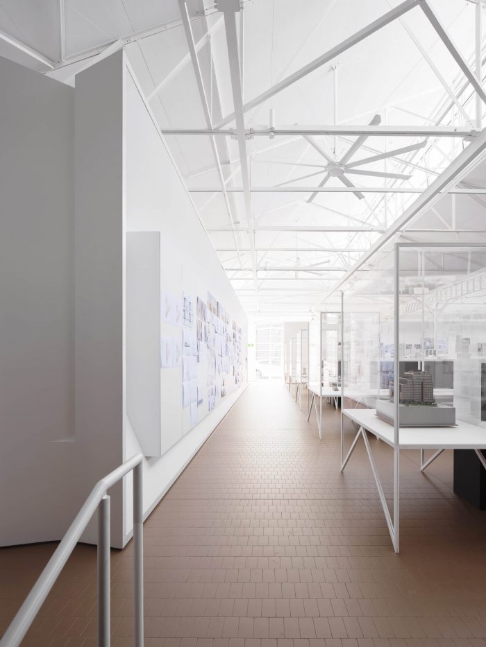 室内庆祝了建筑过程和制作的喜悦,它反映了我们的设计和工作过程。四个14米长的独立细木工板单元创造了一个方形的 "房间",里面有五张长桌。这些细木家具单元作为大型 "相框",上面钉着设计草图和文件图纸,在我们的项目中循环使用。每个工作区尽头的10个大型展示柜为空间带来了秩序和节奏感。在独立的细木家具后面,单元是辅助空间,包括材料库、模型车间、食堂和接待处。桁架、起重机和地板被保留下来,并辅以工业元素,如雕塑般的钢丝栏杆。