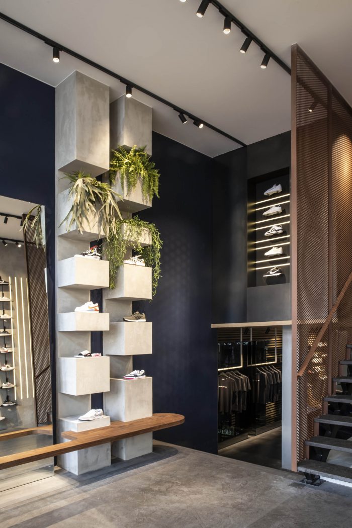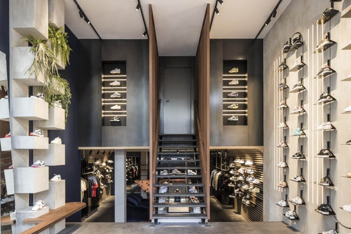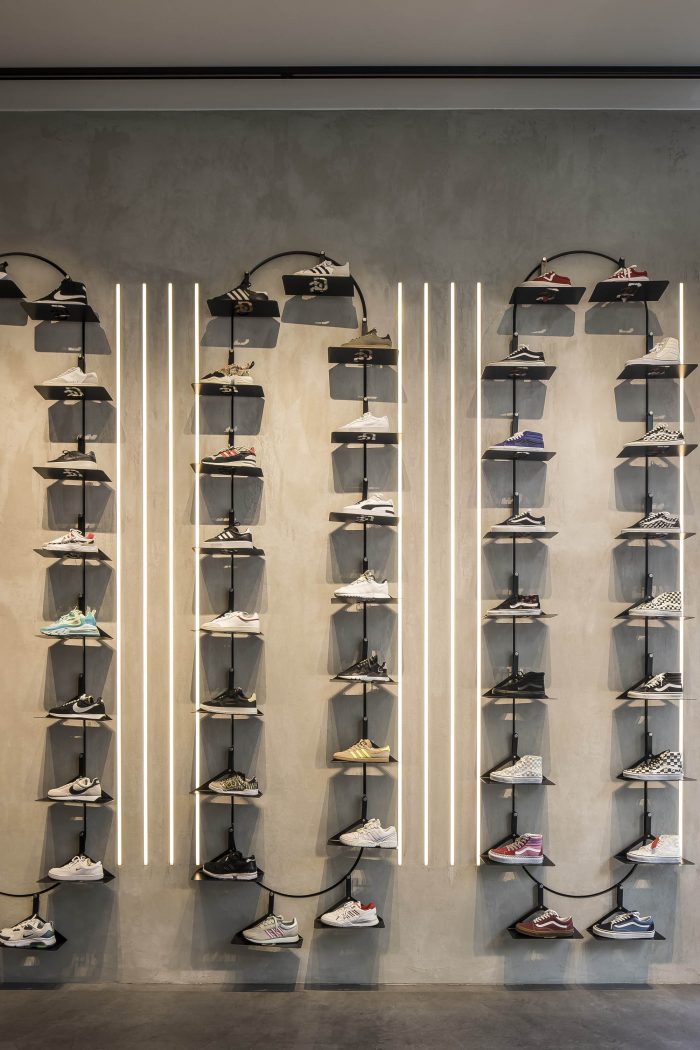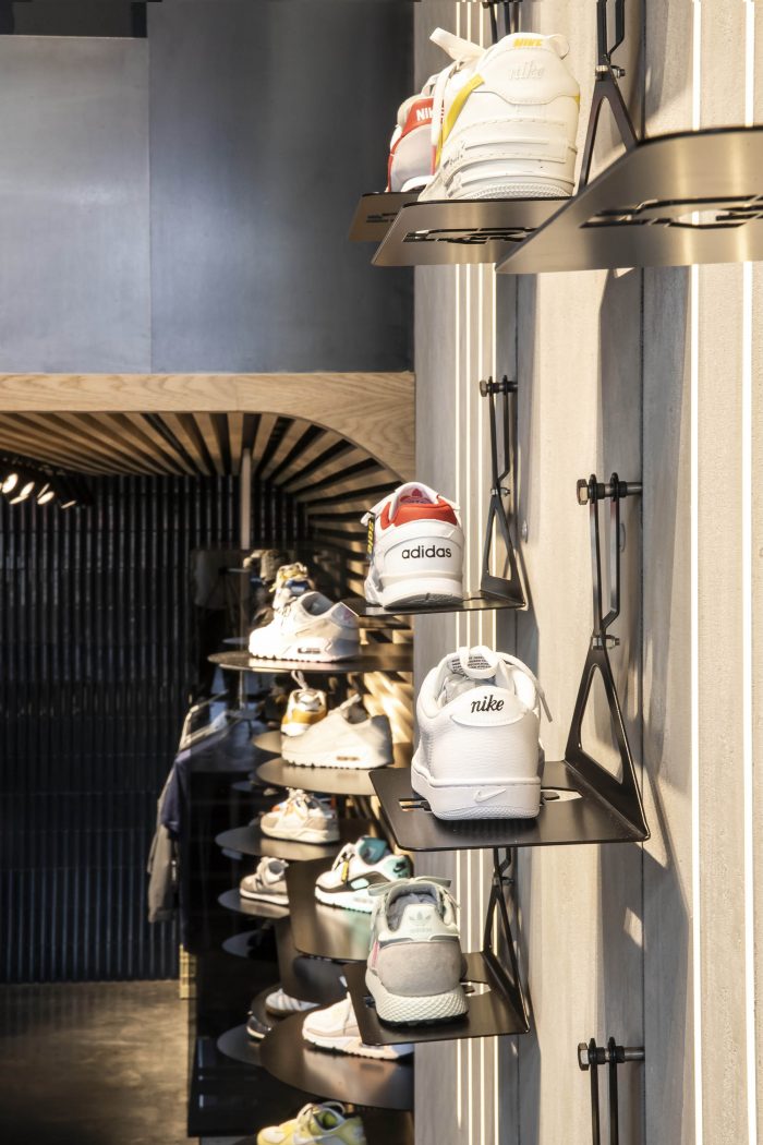 创意。运动鞋文化和工艺是这个项目的灵感来源,并通过标志性的语句和可持续的原始材料来体现。这种态度从前门开始。外立面被修复,褪色的遮阳棚被替换成品牌时刻:无衬线的Sneaker District字样,就像他们销售的品牌一样大胆,点缀着亮黑色的窗框。