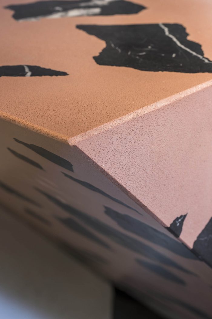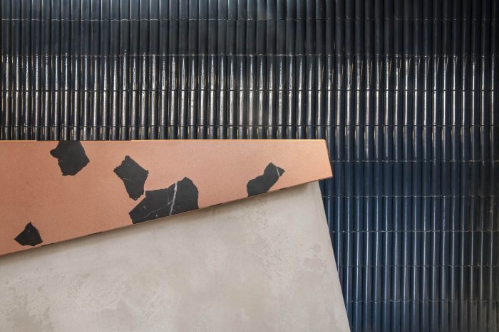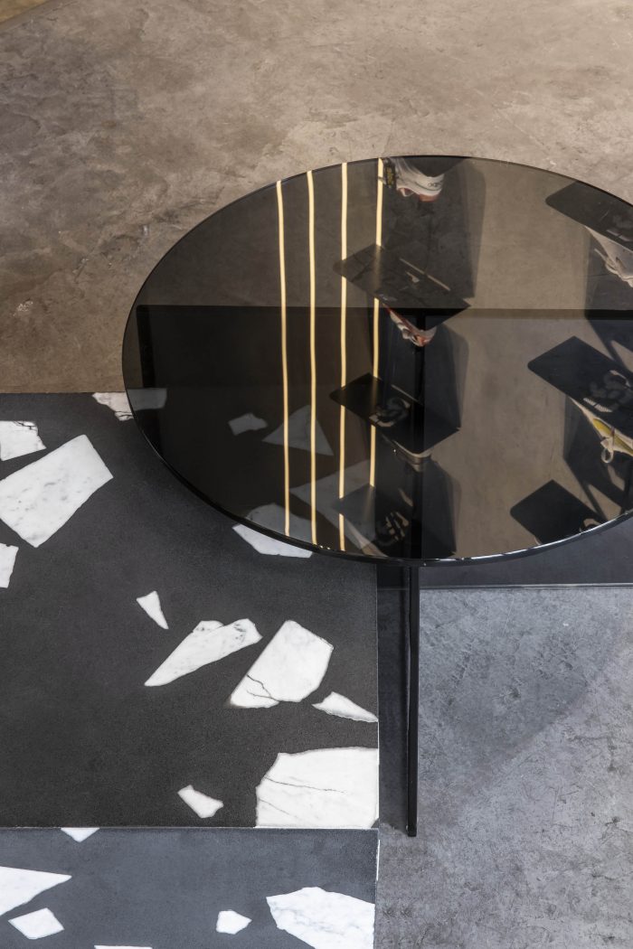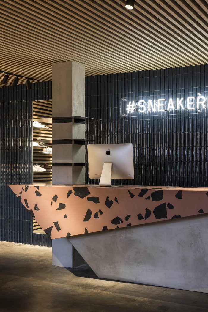Sustainability. Social, economic, and environmental wellbeing has all been considered in this project. Socially, it’s a space where anyone can stop by to learn about the sneaker world and connect with others. Economically, we partnered with local building companies, universities, suppliers, and the Sneaker District community to benefit all who came across this project. And finally, for the environment, we focused on a flexible store design that’s adaptable for different occasions and uses sustainable materials. The point-of-sale counter can be transformed into a bar, while the LED lighting and shelving can be adjusted or moved depending on what’s needed. The concrete floor was kept and restored along with the original facade. We also selected recycled marble, eco-friendly paint, and natural clay wall finish to bring this store to life.